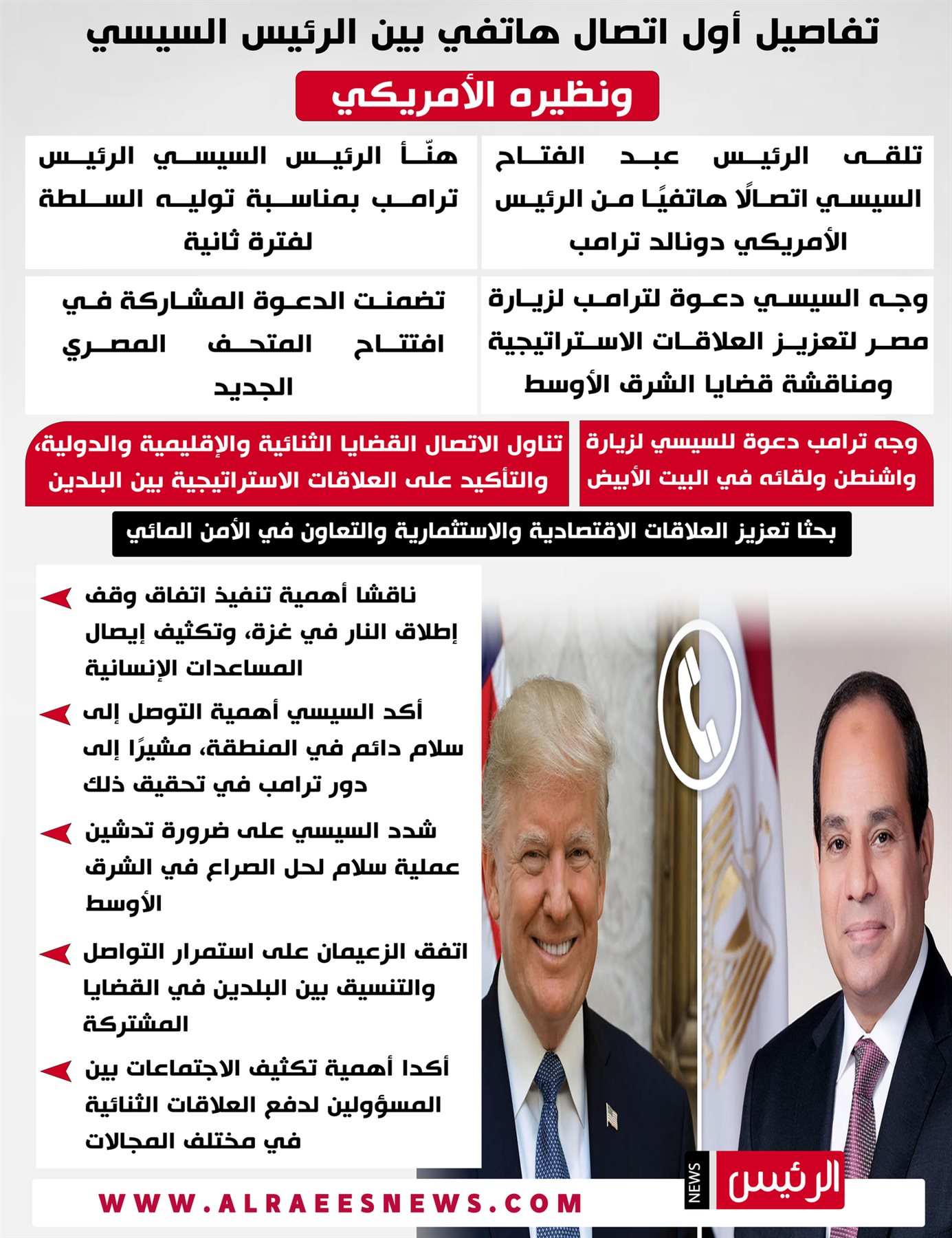 كما وجه الرئيس السيسي الدعوة للرئيس ترامب لزيارة مصر في أقرب فرصة ممكنة، لتعزيز العلاقات الاستراتيجية بين البلدين والتباحث حول القضايا والأزمات المعقدة التي تمر بها منطقة الشرق الأوسط، مما يسهم في دعم استقرار المنطقة، وكذا للمشاركة في افتتاح المتحف المصري الجديد.