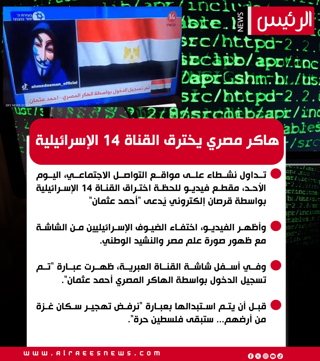 متداول| هاكر يخترق القناة الـ14 الإسرائيلية ويذيع النشيد الوطني المصري
