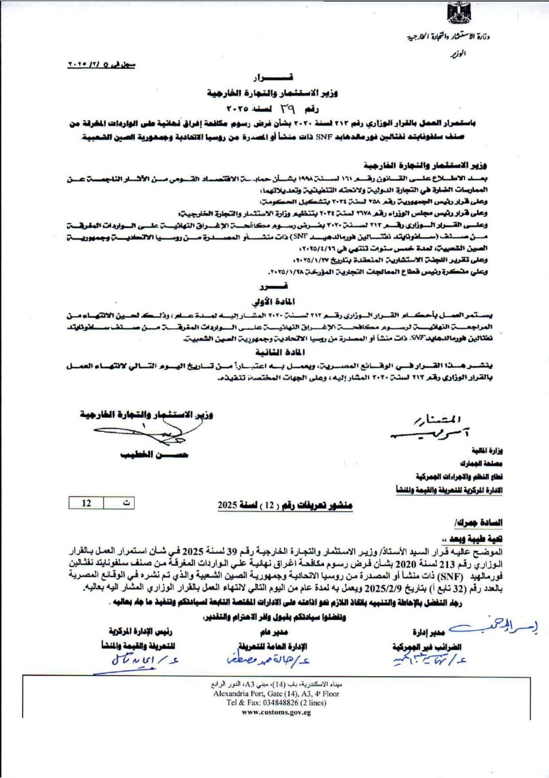 تلقت المنافذ الجمركية إفادة من وزارة الاستثمار والتجارة الخارجية بإعادة فرض رسوم مكافحة إغراق نهائية على الواردات المغرقة من صنف سلفونايتد نفثالين فورمالهيد ذات منشأ أو المصدرة من روسيا الاتحادية وجمهورية الصين الشعبية.