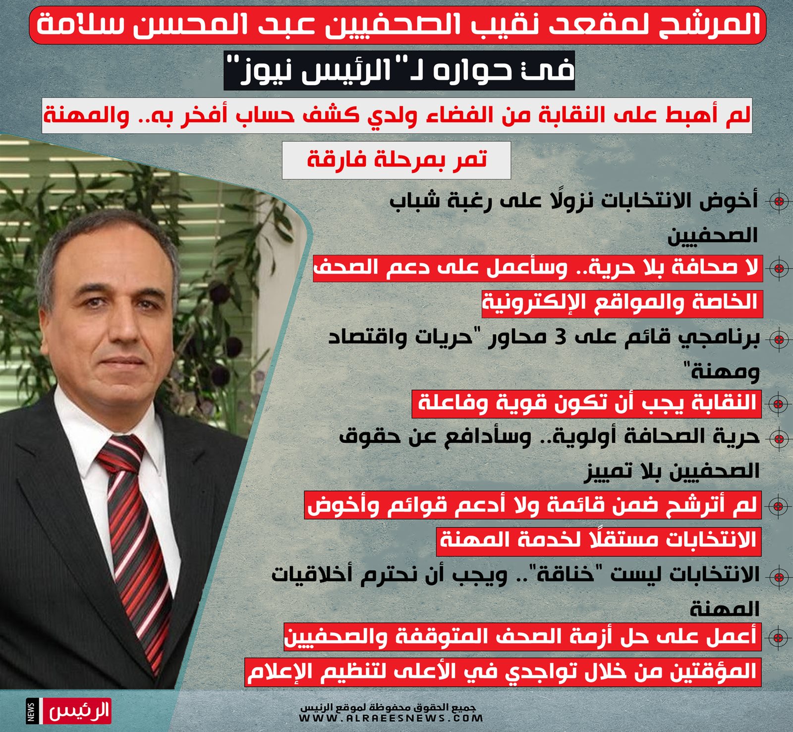 لدي ثلاث محاور مهمة في برنامجي، ولا يكتمل محور مهم دون الأخر، والمحور الأول هو ملف الحريات، لأنه لا صحافة بلا حرية، فالحرية هي غذاء ودواء المهنة، وسأعمل بقدر المستطاع في ملف الزملاء المقيدة حريتهم، وإن شاء الله ستجدوا تطور ملموس في هذا الملف، أما المحور الثاني فهو الملف المهني، وسأقف ضد إغلاق أي موقع أو صحيفة، فأنا دائما ضد مبدأ الإغلاق، لأن أي موقع أو صحيفة نافذة يشرق منها الشمس، وسأعمل على دعم هذه المواقع والصحف الخاصة التي تعاني، أما المحور الثالث هو الملف الاقتصادي، لأن لا كرامة للصحفي بدون حماية اجتماعية واقتصادية، ولدي تصور كامل في هذا الملف، سأعلن عنه في حينه.