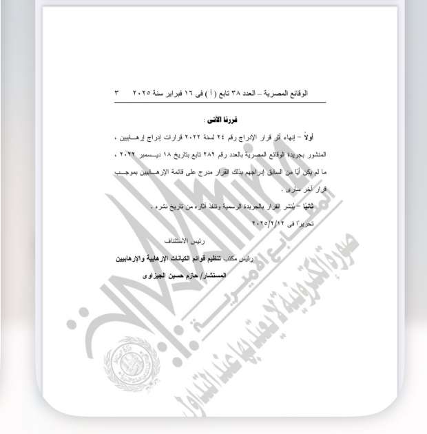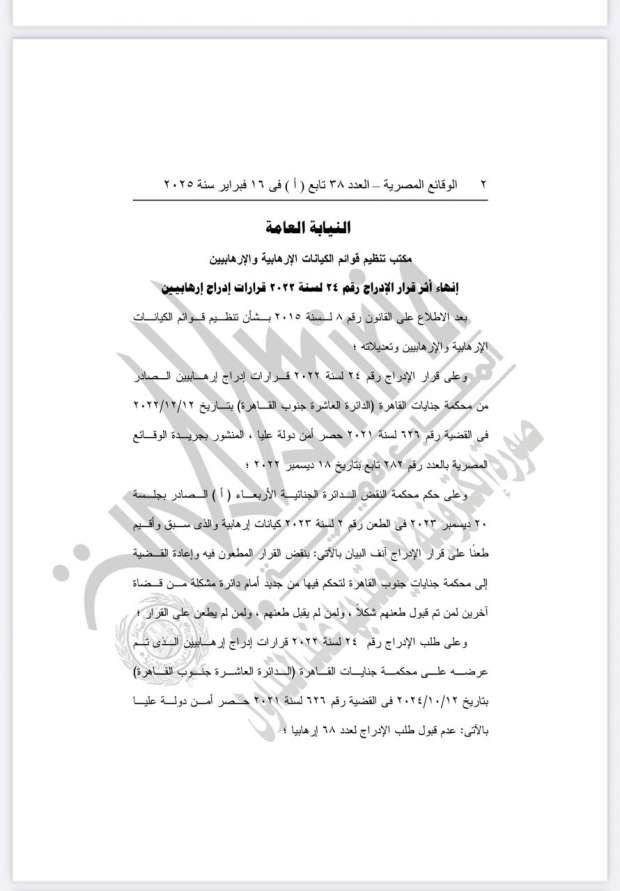 يأتي إنهاء أثر الإدارج بعد قرار لمحكمة جنايات القاهرة في أكتوبر 2024 بعدم قبول طلب إعادة إدراج المتهمين، بحسب ما نشرته الجريدة الرسمية.