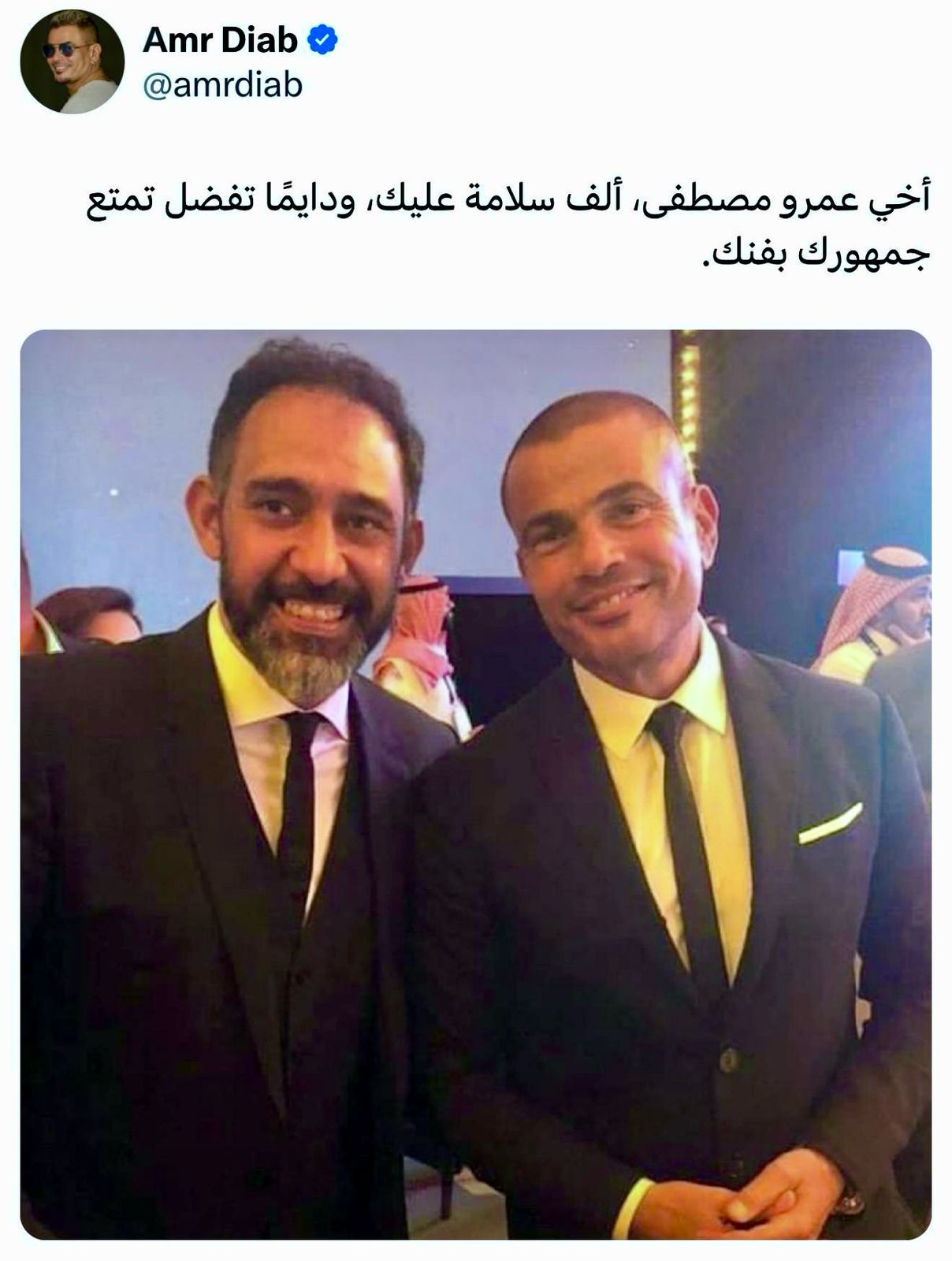 وكتب عمرو دياب عبر حساباته على مواقع التواصل الإجتماعي: "أخي عمرو مصطفى، ألف سلامة عليك، ودايمًا تفضل تمتع جمهورك بفنك".
