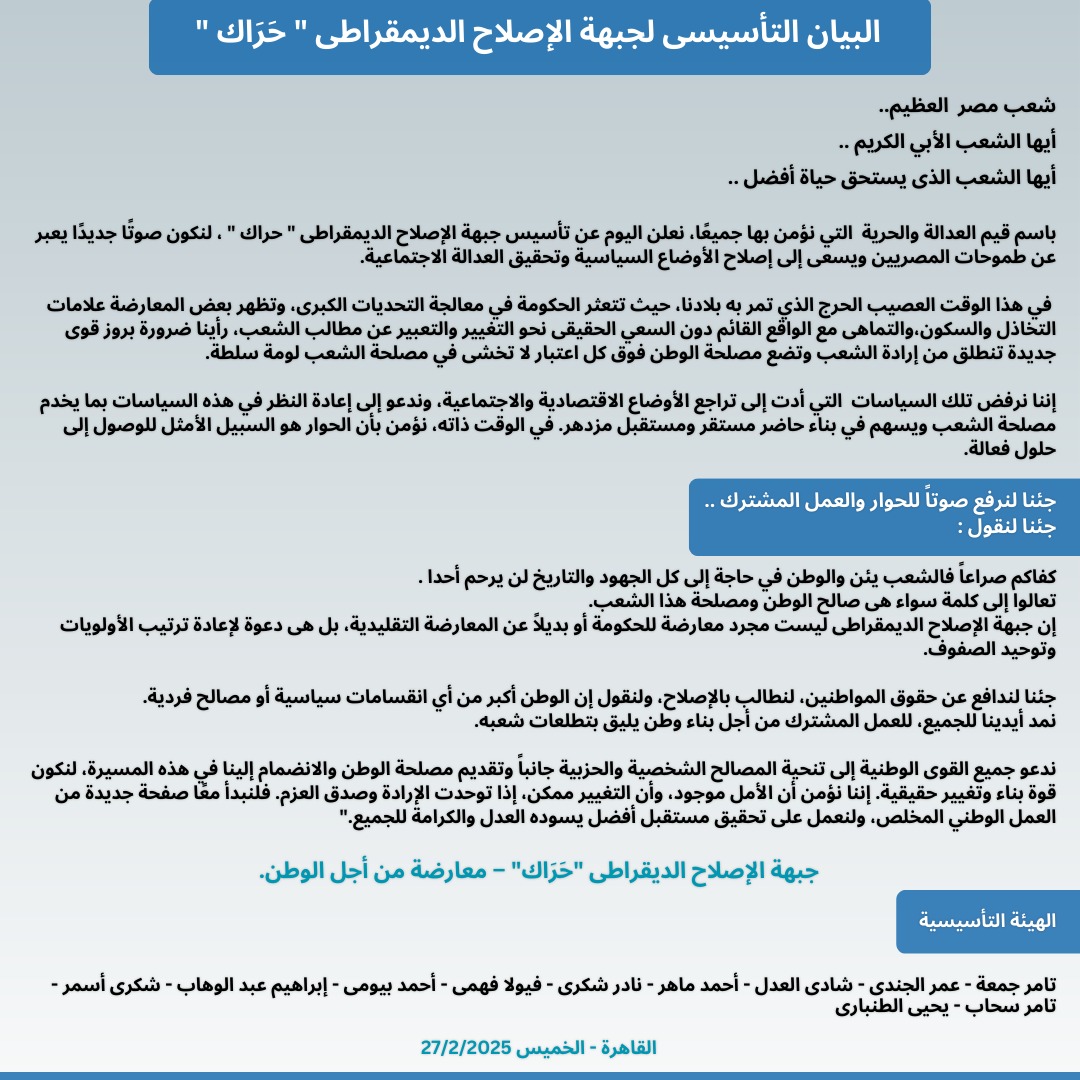 أعلن مجموعة من الشخصيات العامة والنشطاء السياسيين عن تأسيس جبهة تحت اسم "حراك"، في خطوة تهدف إلى إعادة ترتيب الأولويات الوطنية، وتعزيز الحوار السياسي، والعمل على تحقيق الإصلاح الديمقراطي والعدالة الاجتماعية في مصر.