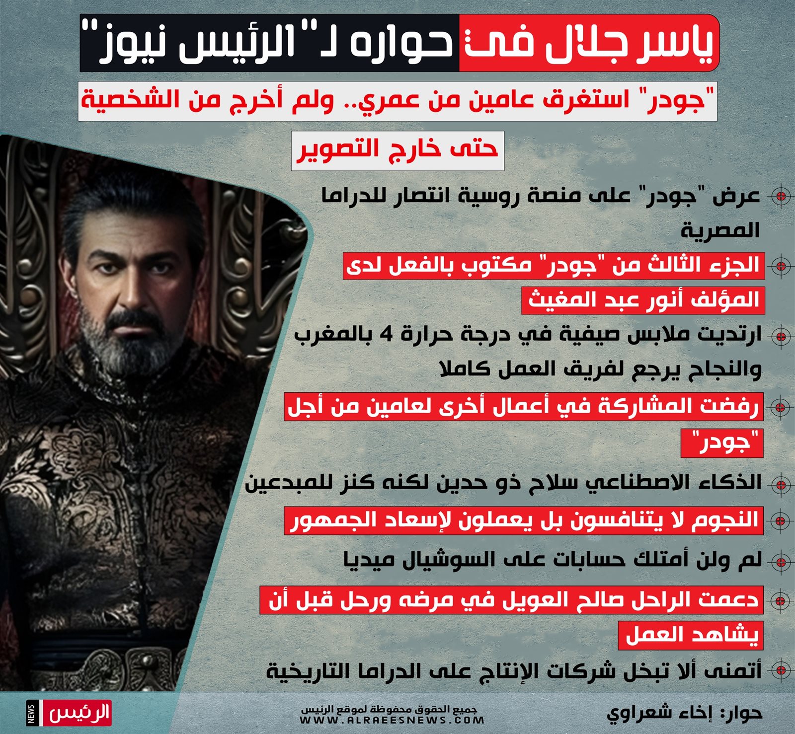 والله عرض مسلسل جودر على منصة روسية يعد انتصار للدراما المصرية والعربية، فهو شيء كبير جدا إن الدراما المصرية تصل للعالمية، وهذا الأمر أشعرني بسعادة بالغة جدا وفخر كبير، ولا أعرف موضوع الدبلجة، ولكن أعتقد إن الشركة المتحدة أرسلت العمل لمنصة روسية قامت بدبلجته، ومعلوماتي أن العمل مطلوب جدا في منصات عالمية أخرى كثيرة، ودائما هذا النوع من الأعمال الدرامية يكون مطلوب على مستوى العالم، لأنه تراث عالمي وتحديدا مأخوذ عن ألف ليلة وليلة، وأطالب الشركة المنتجة بألا تبخل علينا في انتاج هذه النوعية من الأعمال، خاصة أن مردودها المادي يكون أكبر بكثير من الأعمال العادية برغم تكلفة إنتاجها المرتفعة.