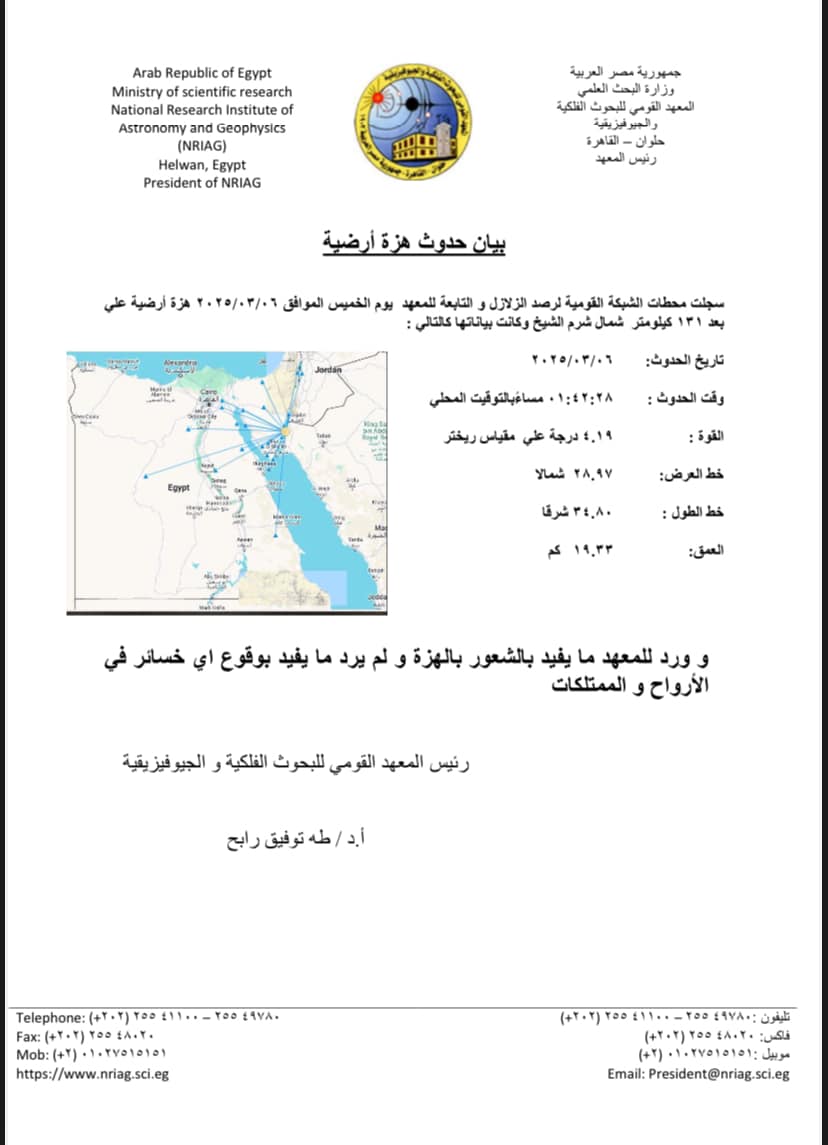سجلت محطات الشبكة القومية لرصد الزلازل التابعة للمعهد القومي للبحوث الفلكية، اليوم الخميس، هزة أرضية على بعد 131 كيلو متر شمال شرم الشيخ.