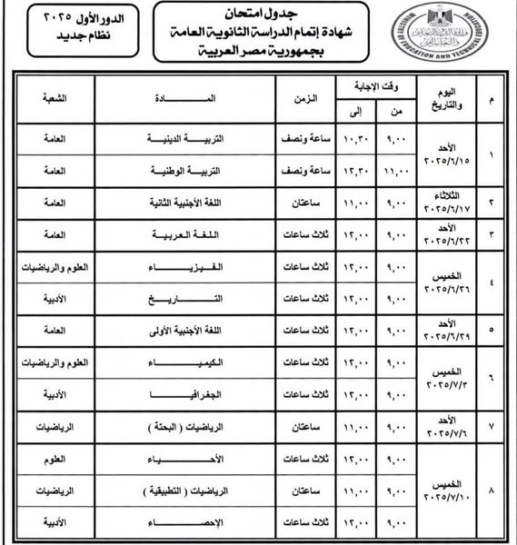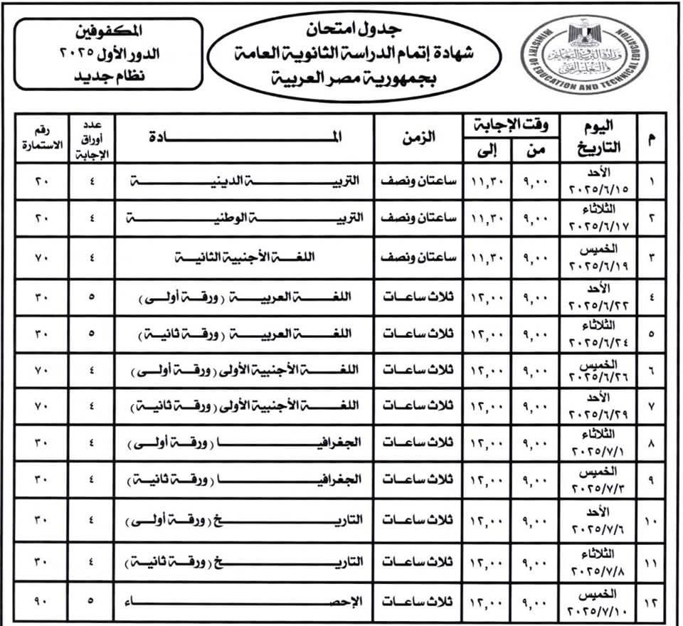 جدول امتحانات الثانوية العامة 2025 للشعبتين