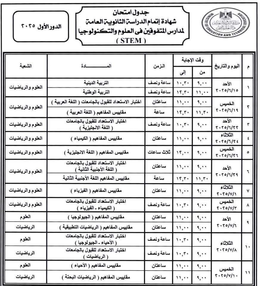 - الأحد 15 يونيو 2025: امتحان مادة التربية الدينية والوطنية.