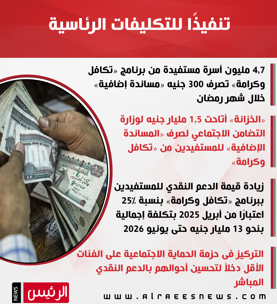 تنفيذًا للتكليفات الرئاسية، أعلنت وزارتي المالية والتضامن الاجتماعي منح مستفيدي برنامج الدعم النقدي تكافل وكرامة منحة إضافية خلال شهر رمضان.