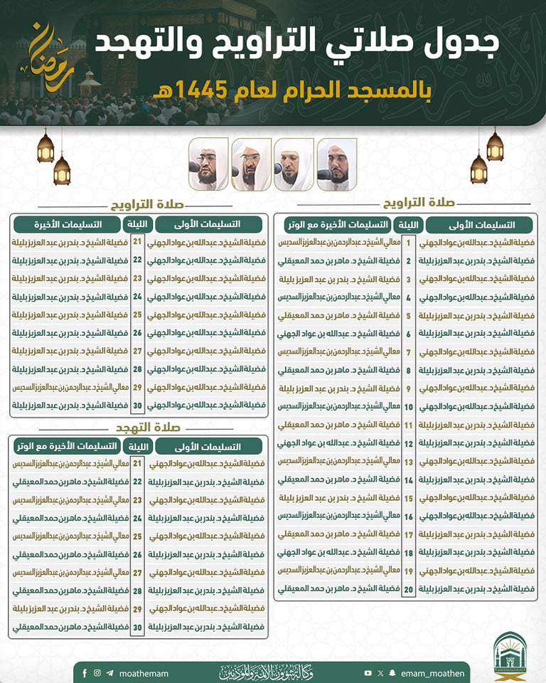أئمة الحرم المكي في الليلة 22 من رمضان: الشيخ “عبدالله الجهني” في التسليمتان الأولى، الشيخ “الوليد الشمسان” في التسليمتان الثانية، والشيخ “عبدالرحمن السديس” في التسليمة الأخيرة مع الوتر.
