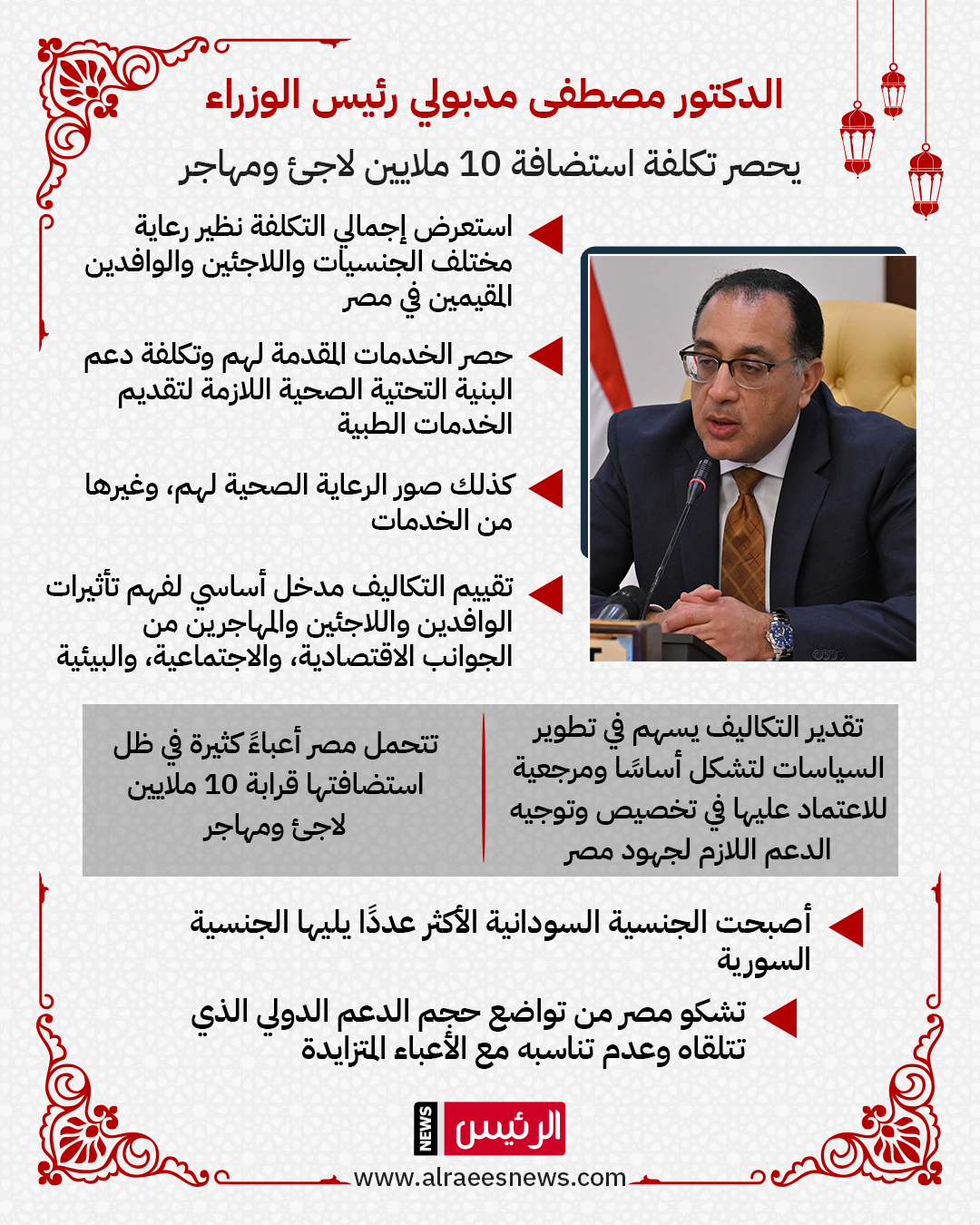 وفي الإنفوجراف التالي، نستعرض أبرز تصريحات مدبولي خلال لقاء مع وزيرة التضامن بشأن حصر تكلفة استضافة 10 ملايين لاجئ ومهاجر: