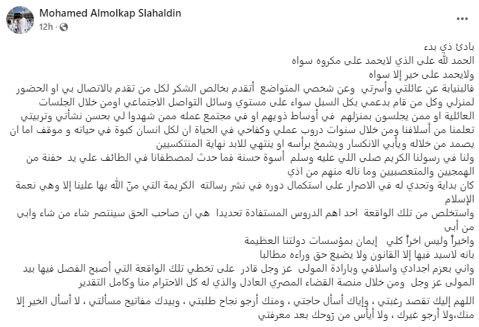 واستطرد: "وإني بعزم أجدادي وأسلافي وبإرادة المولى عز وجل قادر على تخطي تلك الواقعة التي أصبح الفصل فيها بيد المولى عز وجل، ومن خلال منصة القضاء المصري العادل، والذي له كل الاحترام منا وكامل التقدير".
