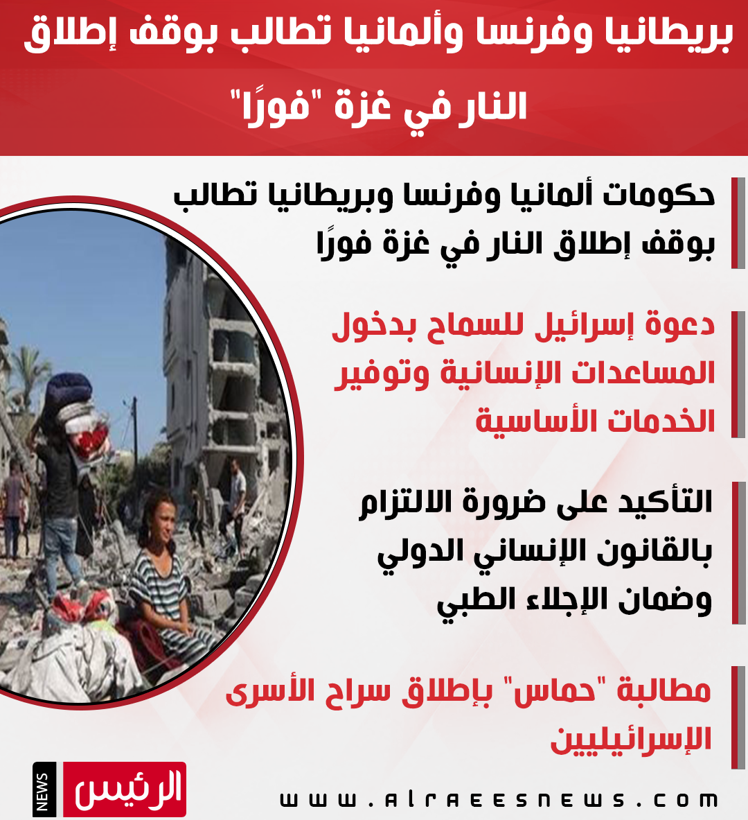 وأكد وزراء خارجية فرنسا وألمانيا والمملكة المتحدة أنه يجب على إسرائيل أن تحترم تماما القانون الدولي وتسمح بدخول المساعدات فورا، كما يجب حماية المدنيين وعدم قطع المعونات أو المساعدات الأساسية عنهم.