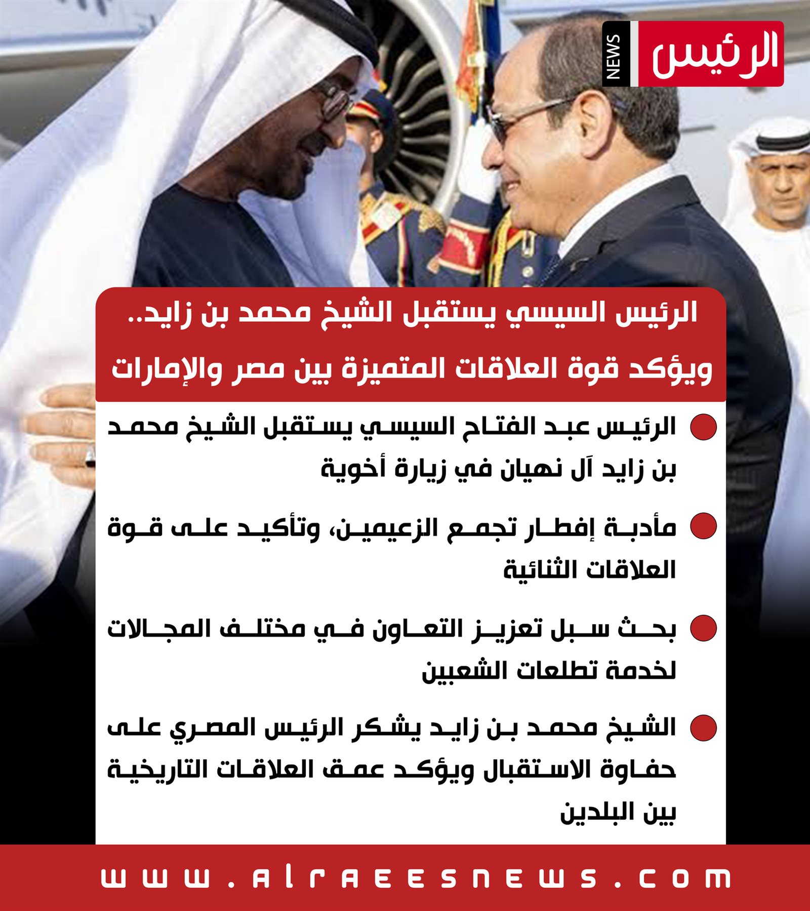 وأوضح المتحدث الرسمي باسم رئاسة الجمهورية أن الزيارة تأتي في إطار أخوي، في ضوء العلاقات الأخوية الوثيقة التي تربط الرئيس بشقيقه رئيس دولة الإمارات، حيث أقام الرئيس مأدبة إفطار تكريمًا للشيخ محمد بن زايد، تم خلالها التأكيد على قوة العلاقات المتميزة بين البلدين الشقيقين، وبحث سبل تعزيز التعاون في مختلف المجالات، بما يحقق تطلعات الشعبين المصري والإماراتي الشقيقين.
