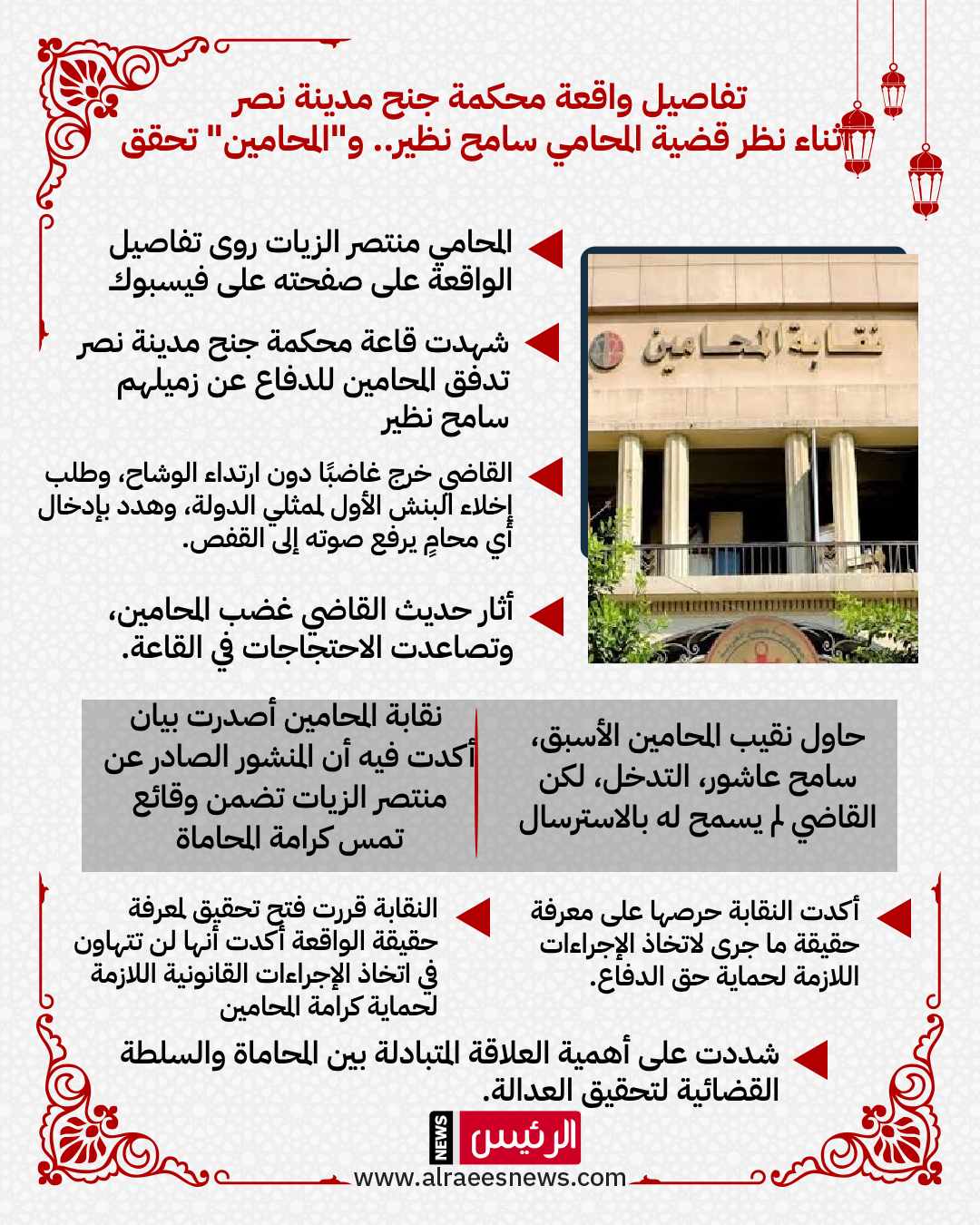 روى المحامي منتصر الزيات روى تفاصيل واقعة محكمة جنح مدينة نصر أثناء نظر قضية المحامي سامح نظير على صفحته الشخصية على موقع فيسبوك، وجاءت كالتالي: