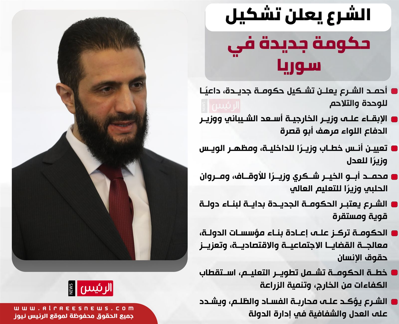 أعلن الرئيس السوري الانتقالي أحمد الشرع، اليوم السبت، تشكيل حكومة جديدة في سوريا، مشيرًا إلى أنها تمثل ميلاد مرحلة جديدة في مسيرة البلاد داعيًا السوريين إلى التلاحم والوحدة.