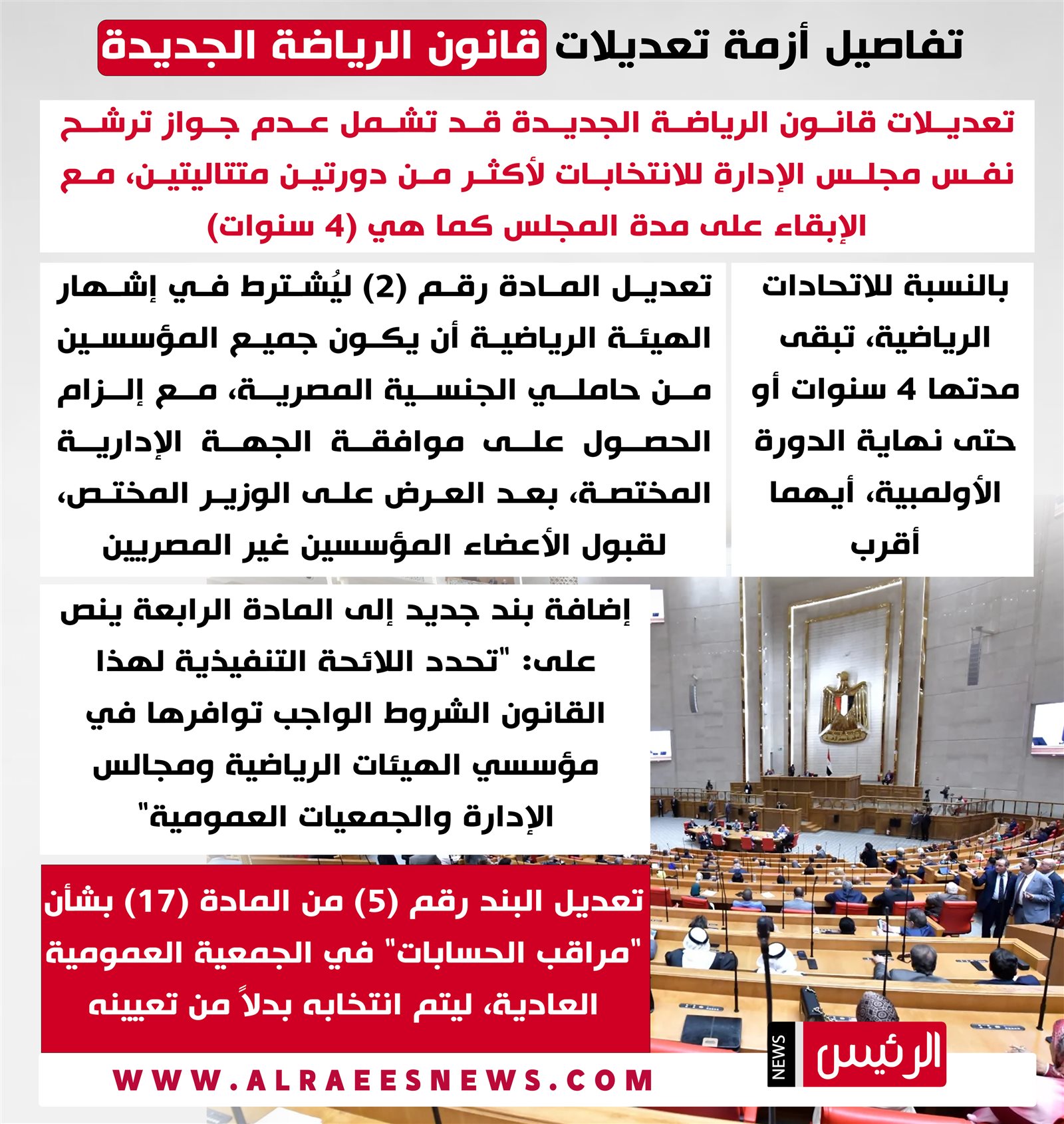 - تعديلات قانون الرياضة الجديدة قد تشمل عدم جواز ترشح نفس مجلس الإدارة للانتخابات لأكثر من دورتين متتاليتين، مع الإبقاء على مدة المجلس كما هي (4 سنوات)