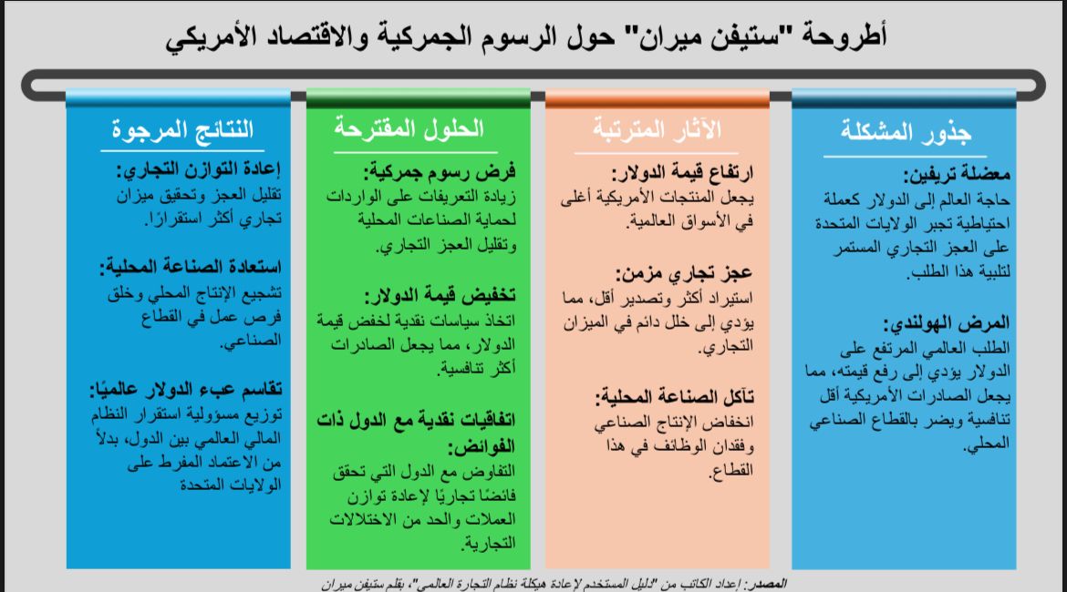 ومن هذا المنطلق، لم تكن خطوة ترامب في فرض الرسوم الجمركية سوى تنفيذ مباشر لحلول اقترحها ميران في ورقته، حيث يُنظر إلى هذه الرسوم باعتبارها أداة مزدوجة، تفرض ضغطًا مباشرًا على المنافسين التجاريين وتنعش إيرادات للدولة، ومن جهة أخرى تُرغم الشركات الكبرى على إعادة توطين مصانعها واستثماراتها داخل الولايات المتحدة.