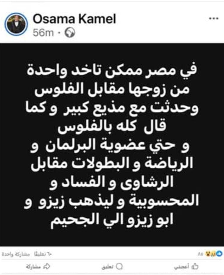 وجاء في منشور كامل: "في مصر ممكن تاخد واحدة من زوجها مقابل الفلوس، وحدثت مع مذيع كبير أو كما قال كله بالفلوس.. وحتى عضوية البرلمان والرياضة والبطولات مقابل الرشاوى والفساد والمحسوبية.. وليذهب زيزو وأبو زيزو إلى الجحيم".