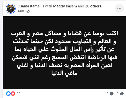 وعلى وقع موجة الغضب حذف كامل المنشور، وحاول تبرير موقفه في منشور آخر وقال فيه: “أكتب يوميا عن قضايا ومشاكل مصر والعرب والعالم والتجاوب محدود، لكن حينما تحدثت عن تأثير رأس المال الملوث على الحياة بما فيها الرياضة انتفض الجميع رغم أنني لا يمكن أهين المرأة المصرية نصف الدنيا وأغلى ما في الدنيا”.