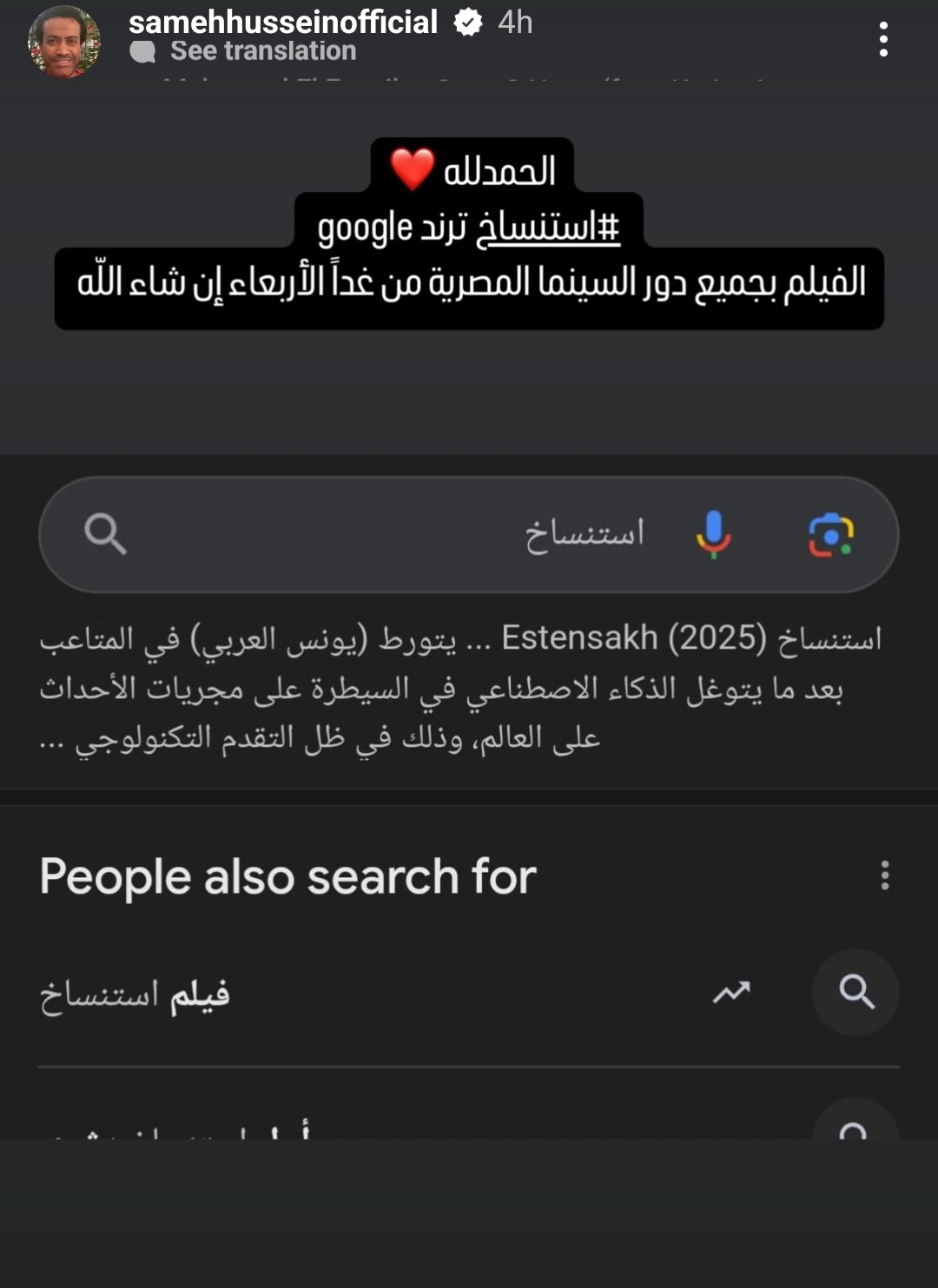 تستقبل دور العرض السينمائية اليوم الاربعاء الموافق 9 إبريل2025، فيلم «استنساخ» بطولة الفنان سامح حسين. وطرح سامح حسين عن البوستر الدعائي للفيلم وكذلك البرومو الرسمي للفيلم على حسابه بموقع إنستجرام، وعلّق عليه: “عندما تختفي الحدود بين الواقع والخيال.. البوستر الرسمي لفيلم استنساخ، 9 أبريل بجميع دور العرض المصرية، وقريبًا في جميع الدول العربية”.