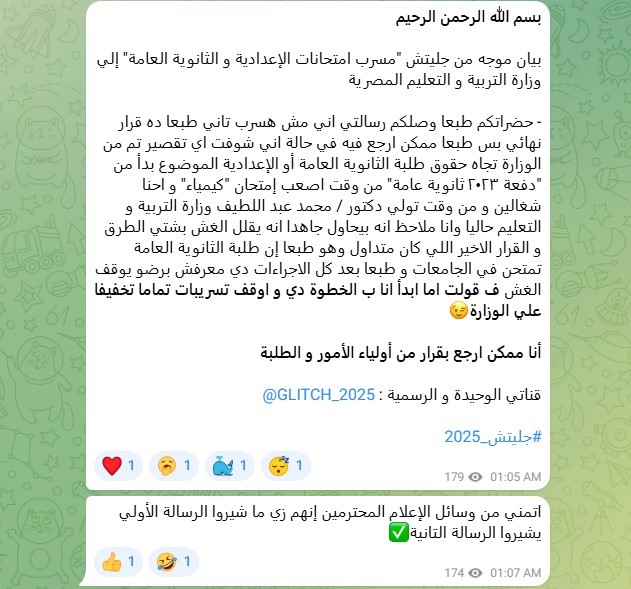 رجع جروب الغش شاومينج عن قرار اعتزال تسريب امتحانات الثانوية العامة والشهادة الإعدادية موجهة رسالة إلى وزارة التربية والتعليم قائلا فيها: في بيان موجه من جليتش "مسرب امتحانات الإعدادية والثانوية العامة" إلي وزارة التربية والتعليم المصرية".