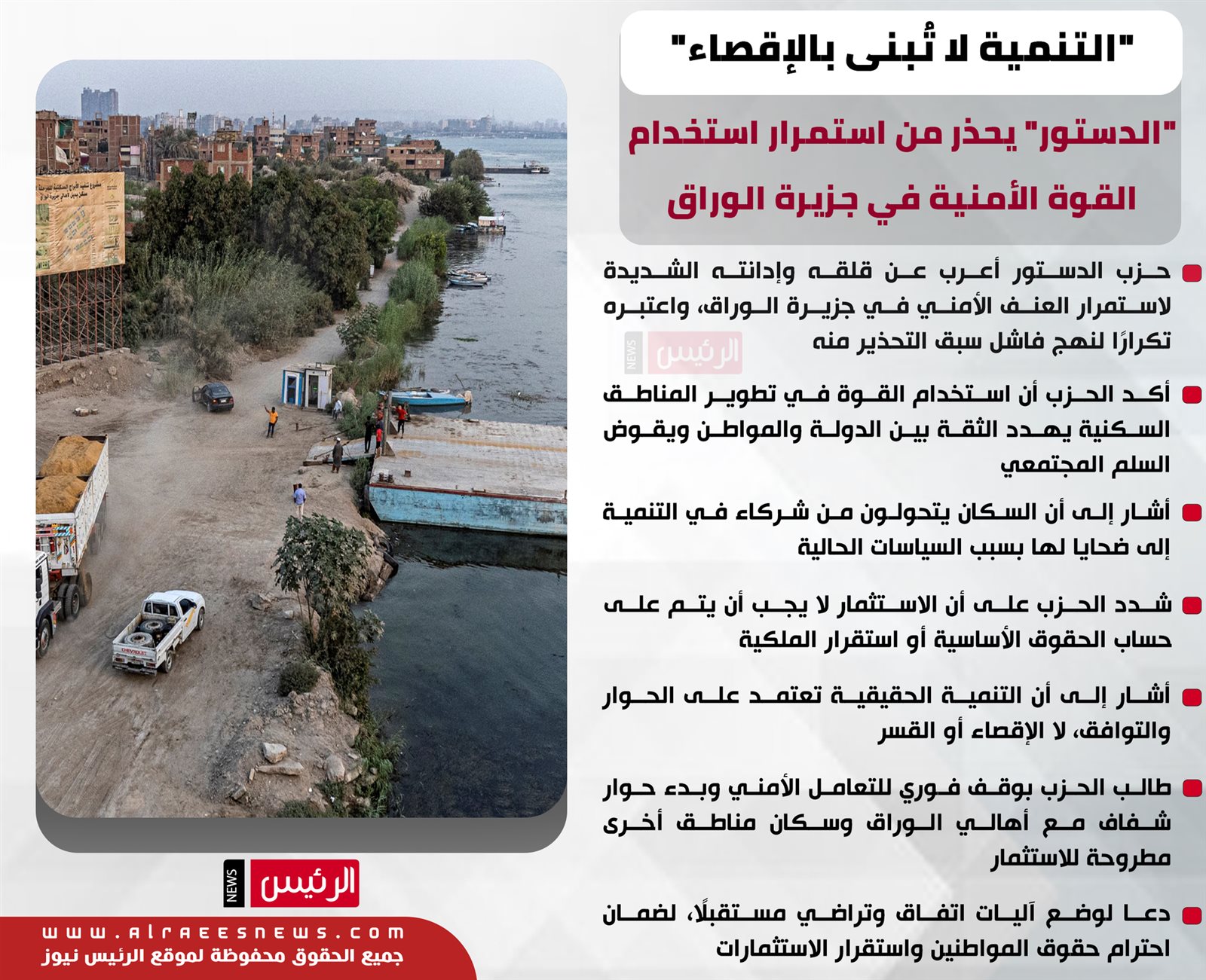 وطالب الحزب بوقف فوري للتعامل الأمني، وبدء حوار جاد وشفاف مع أهالي الوراق، وكذلك مع سكان المناطق الأخرى المطروحة للاستثمار مثل النجيلة والضبعة ورأس الحكمة وغيرها.