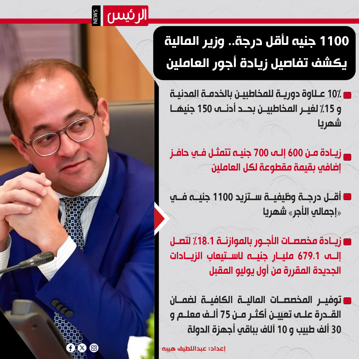 وفي السياق، أكد أحمد كجوك وزير المالية، أنه سيتم صرف مرتبات شهر يوليو 2025 بالزيادات الجديدة للعاملين بالدولة، كاشفًا أن أقل درجة وظيفية ستزيد 1100 جنيه في إجمالي الأجر بشكل شهري.