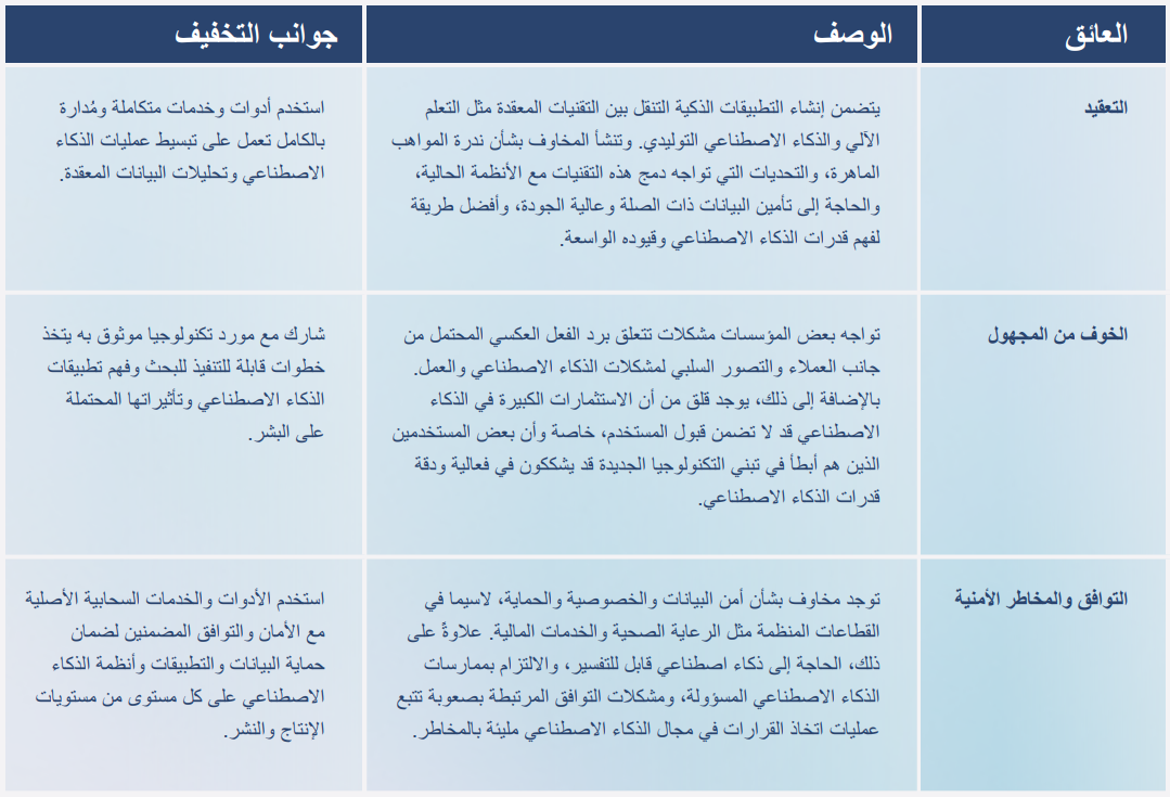 ومن العوائق التي تحول دون اعتماد الذكاء الاصطناعي لابتكار التطبيقات الذكية: