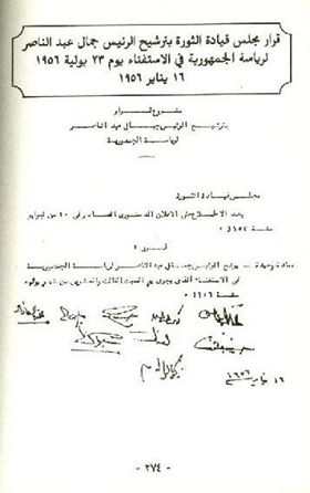 بترشيح جمال عبد الناصر لرئاس الجمهورية، وتظهر في الصور توقيعات أعضاء المجلس من الضباط