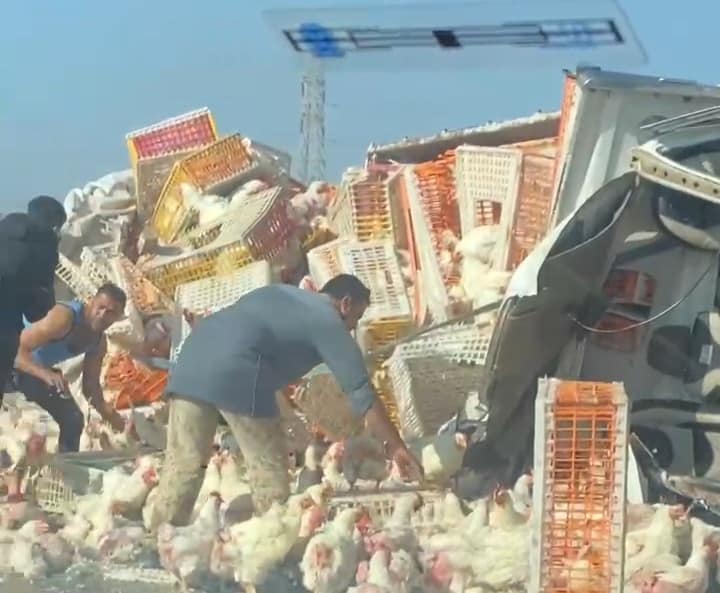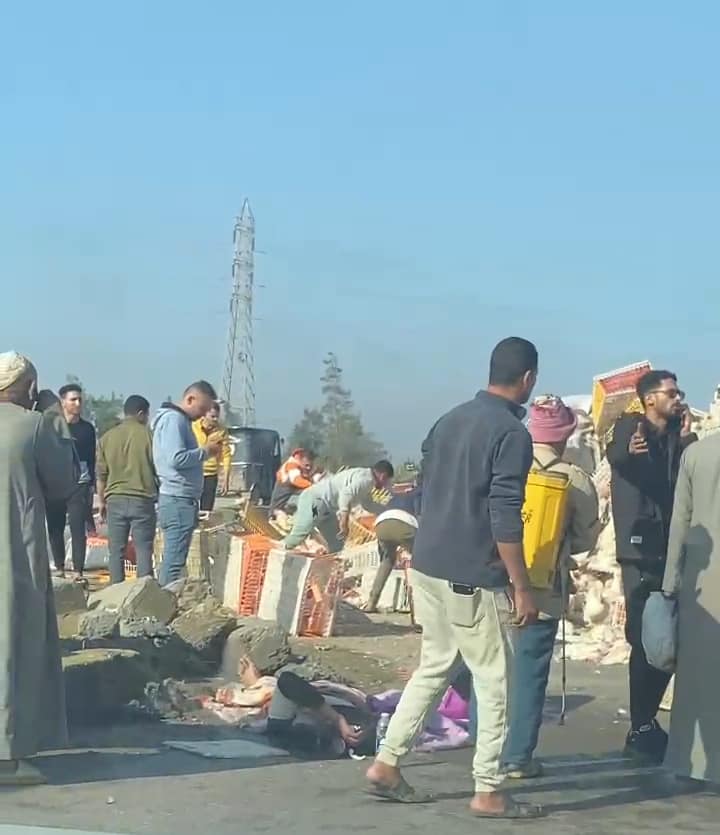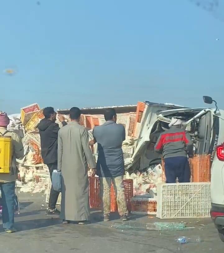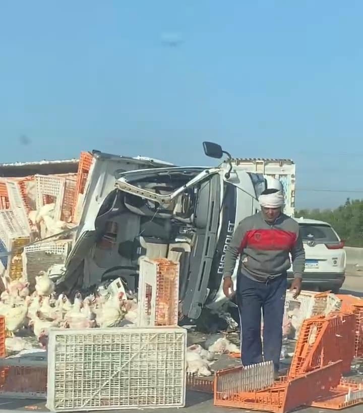 تفاصيل انقلاب سيارة محملة بالدواجن الحية على الطريق الإقليمي (صور)