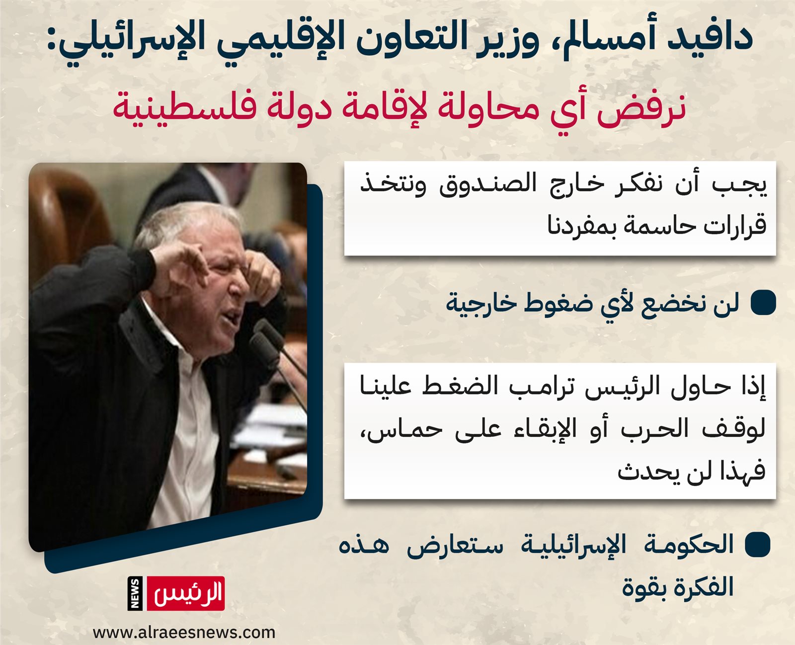 أعلن دافيد أمسالم، وزير التعاون الإقليمي الإسرائيلي، اليوم الثلاثاء، رفض إسرائيل أي محاولة لإقامة دولة فلسطينية.