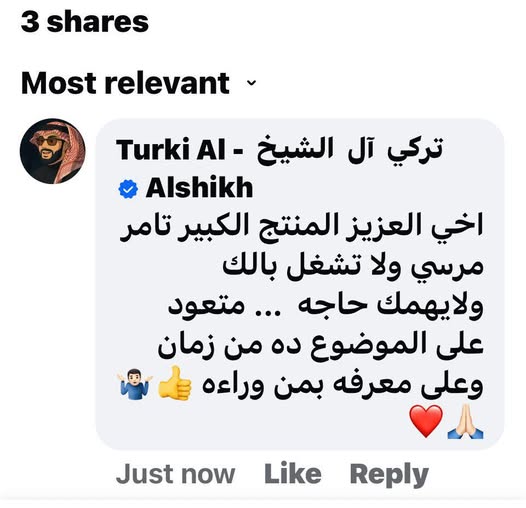 وقال تركي آل الشيخ في منشور له عبر حسابه بموقع التواصل الاجتماعي «فيس بوك»:«أخي العزيز المنتج تامر مرسي ولا تشغل بالك ولا يهمك حاجة، متعود على الموضوع ده من زمان وعلى معرفة بمن وراءه».