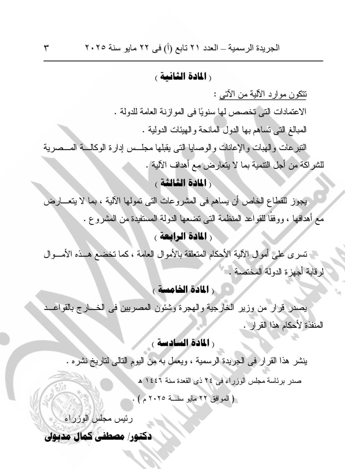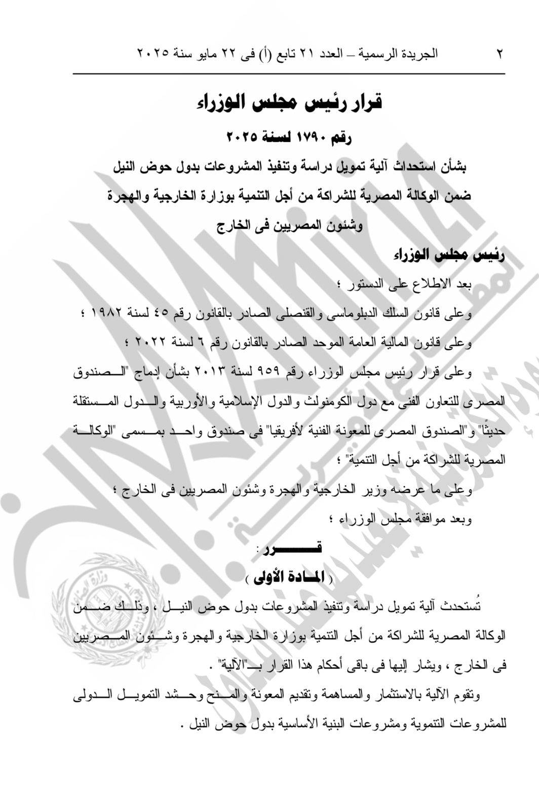نشرت الجريدة الرسمية بعددها رقم 21 تابع (أ) الصادر في 22 مايو سنة 2025، قرار الدكتور مصطفى مدبولي رئيس مجلس الوزراء رقم 1790 لسنة 2025، بشأن استحداث آلية تمويل دراسة وتنفيذ المشروعات بدول حوض النيل ضمن الوكالة المصرية للشراكة من أجل التنمية بوزارة الخارجية والهجرة وشئون المصريين في الخارج.