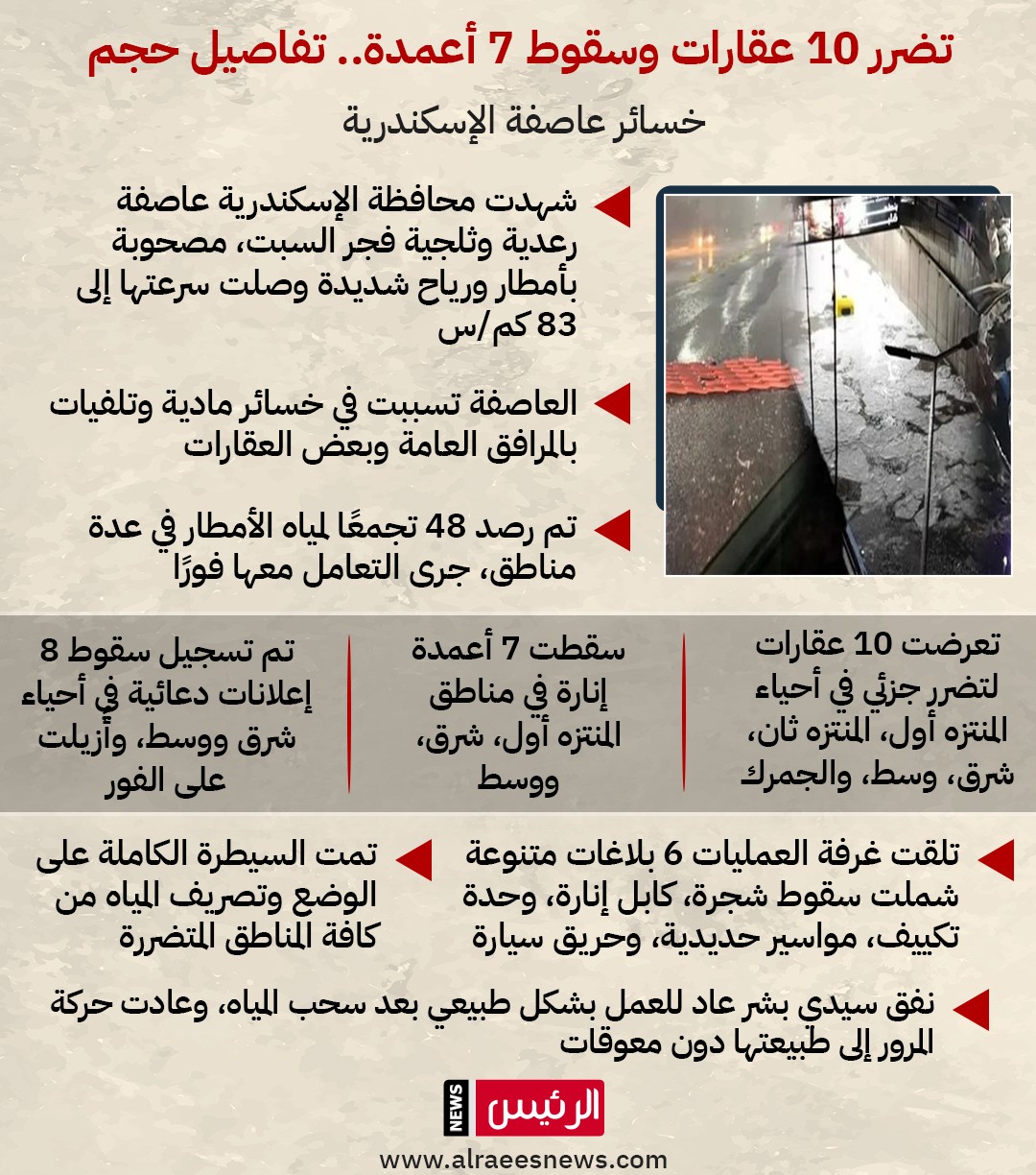 تعرضت محافظة الإسكندرية في الساعات الأولى من صباح اليوم السبت، لعاصفة رعدية وثلجية تخللها سقوط أمطار، مصحوبة بنشاط رياح شديدة بلغت سرعتها 83 كم/س، مما أسفر عن وقوع عدد من الخسائر والتلفيات بالمرافق العامة وبعض العقارات.