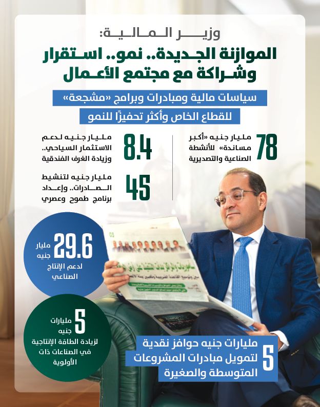 أكد أحمد كجوك وزير المالية، أن هناك موازنة طموحة جدًا بدءًا من شهر يوليو المقبل؛ لتمويل مبادرات «المساندة الاقتصادية» للأنشطة الصناعية والتصديرية، في خطوة قوية بمسار الشراكة مع مجتمع الأعمال، موضحًا أنه تم تخصيص ٧٨ مليار جنيه بالموازنة الجديدة لتحفيز القطاع الخاص على زيادة الإنتاج والتصدير، وتعزيز تنافسية الاقتصاد المصري.
