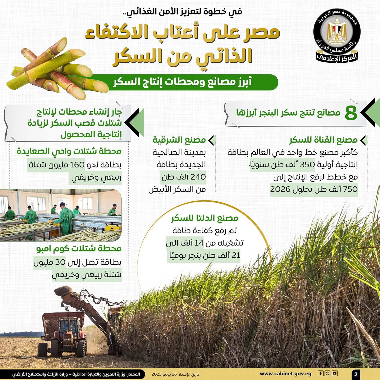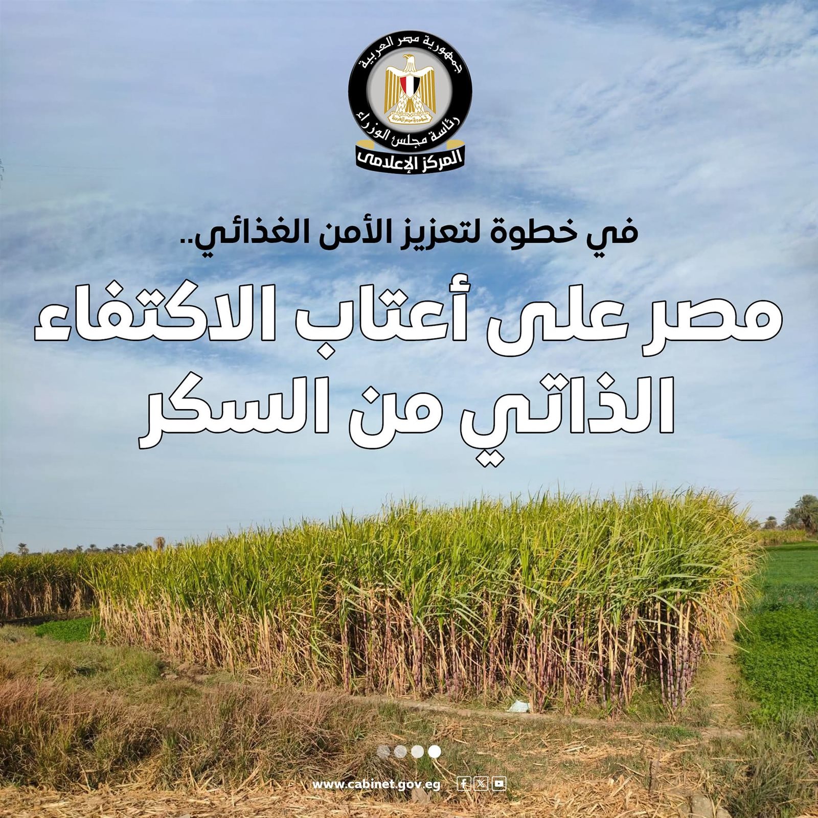 نشر المركز الإعلامي لمجلس الوزراء عددًا من الإنفوجرافات عبر منصاته الرسمية على مواقع التواصل الاجتماعي، استعرض خلالها جهود الدولة في التوسع بزراعة المحاصيل السكرية، ودعم الصناعات المرتبطة بها، بما يضع مصر على أعتاب تحقيق الاكتفاء الذاتي من السكر، باعتباره من السلع الاستراتيجية الهامة.