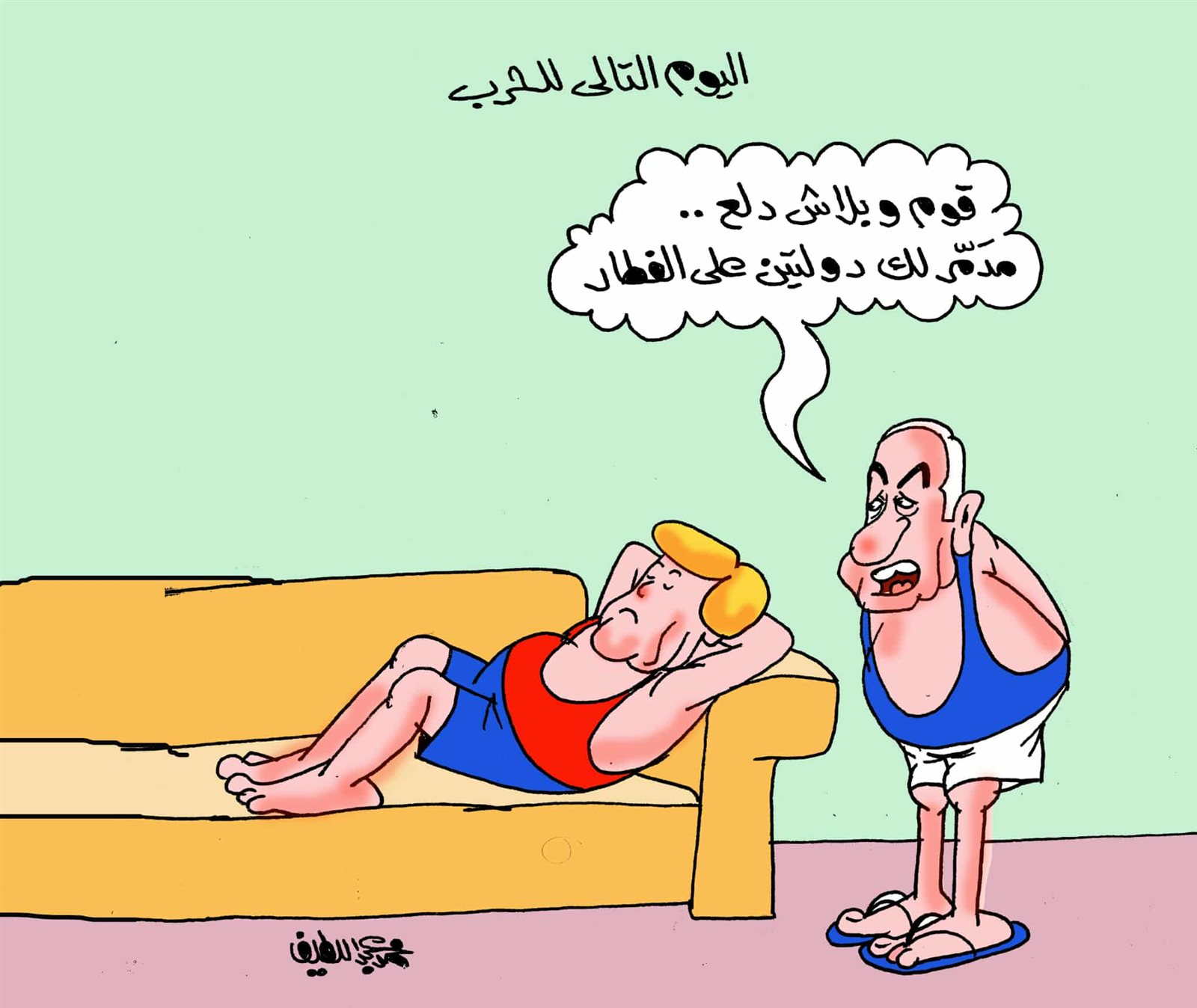 وحمل الكاريكاتير تعليقا: "اليوم التالي للحرب"، بينما يخاطب أحدهم الآخر بلهجة عامية ساخرة قائلا: "قوم وبلاش دلع.. مدّمّر لك دولتين على الفطار!"