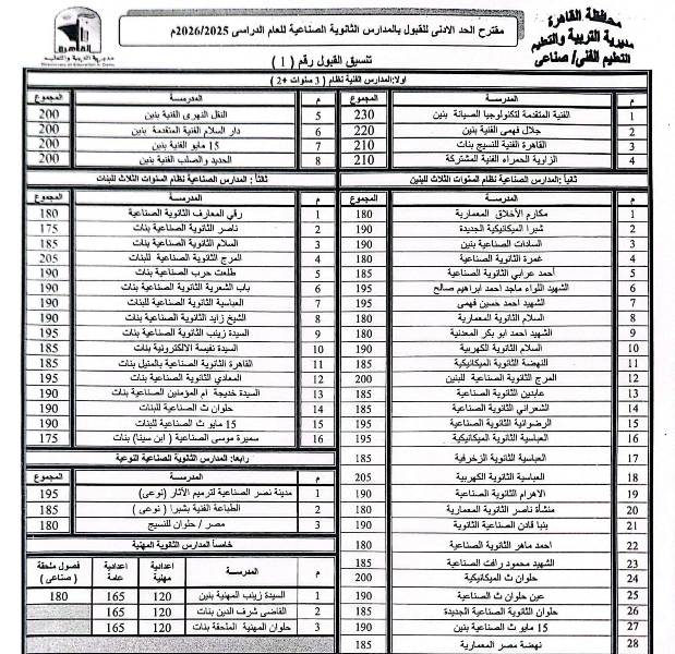 اعتمد الدكتور إبراهيم صابر، محافظ القاهرة، تنسيق التقديم للثانوي العام للعام الدراسي ٢٠٢٥/ ٢٠٢٦، ليكون بحد أدنى ٢٣٠ درجة، وتكون فصول الخدمات أقل من الحد الأدنى للتنسيق الثانوى العام ب ٤٠ درجة.