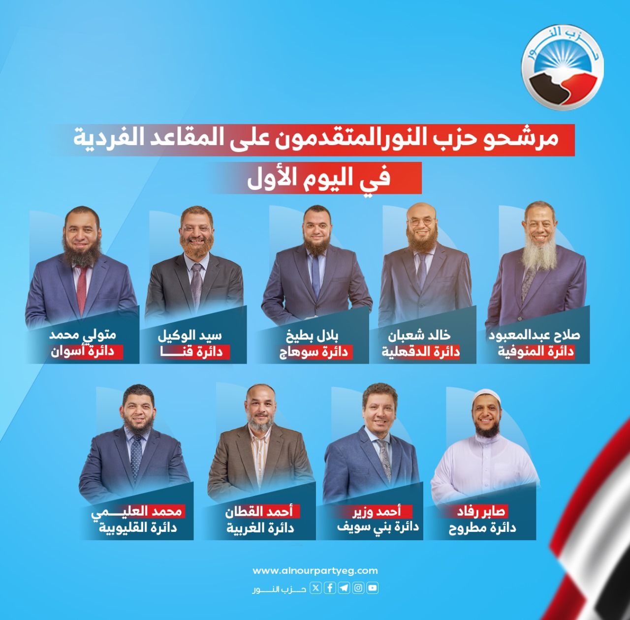 دفع حزب النور بعدد من مرشحيه على المقاعد الفردية في عدد من الدوائر الانتخابية، وذلك في اليوم الأول لتلقي طلبات الترشح لانتخابات مجلس الشيوخ 2025.
