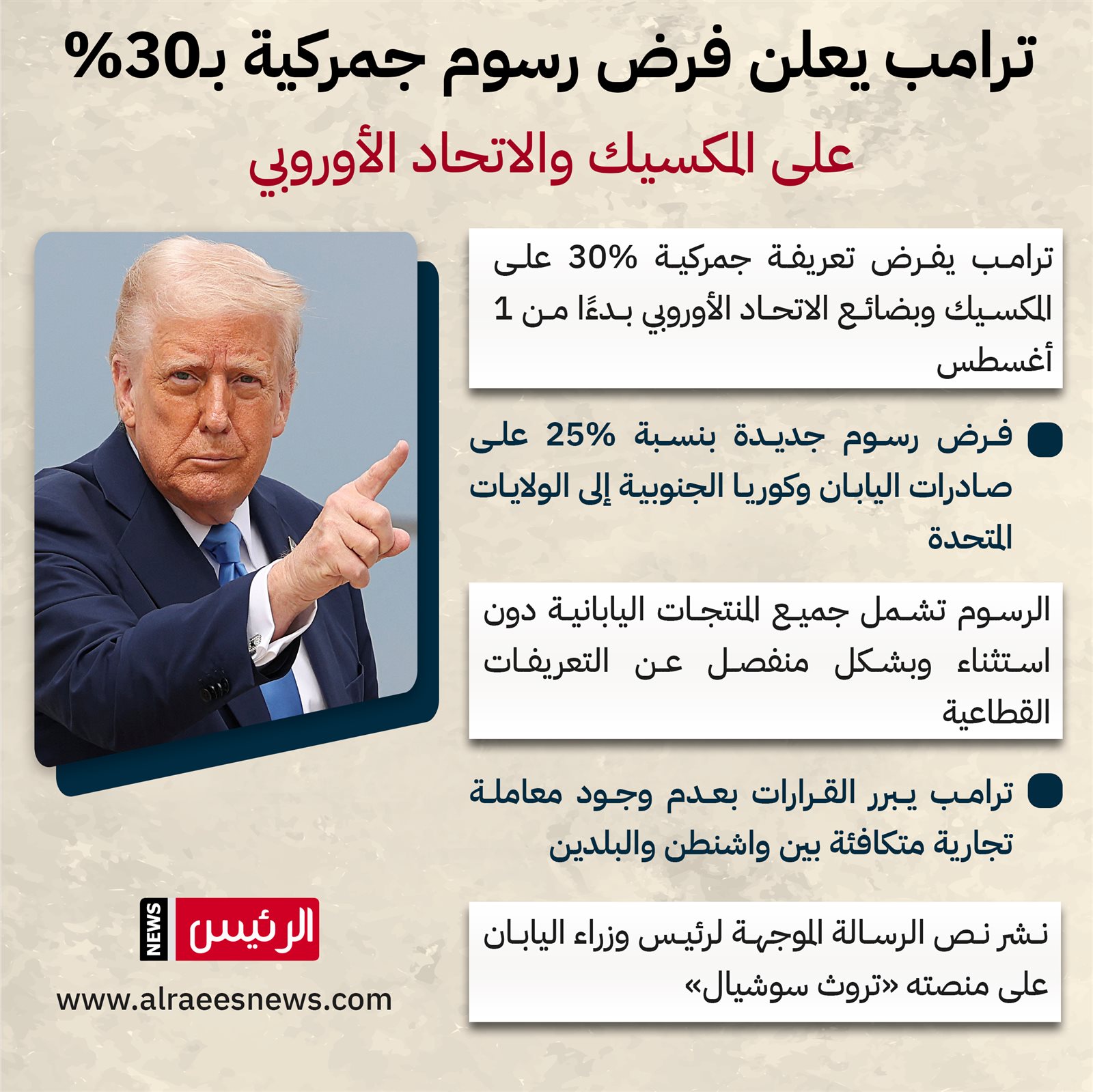 فرض الرئيس الأمريكي دونالد ترامب تعريفة جمركية بنسبة 30% على المكسيك وعلى بضائع الاتحاد الأوروبي اعتبارًا من الأول من أغسطس المقبل، وفقًا لما نقلته وكالة "رويترز" للأنباء.