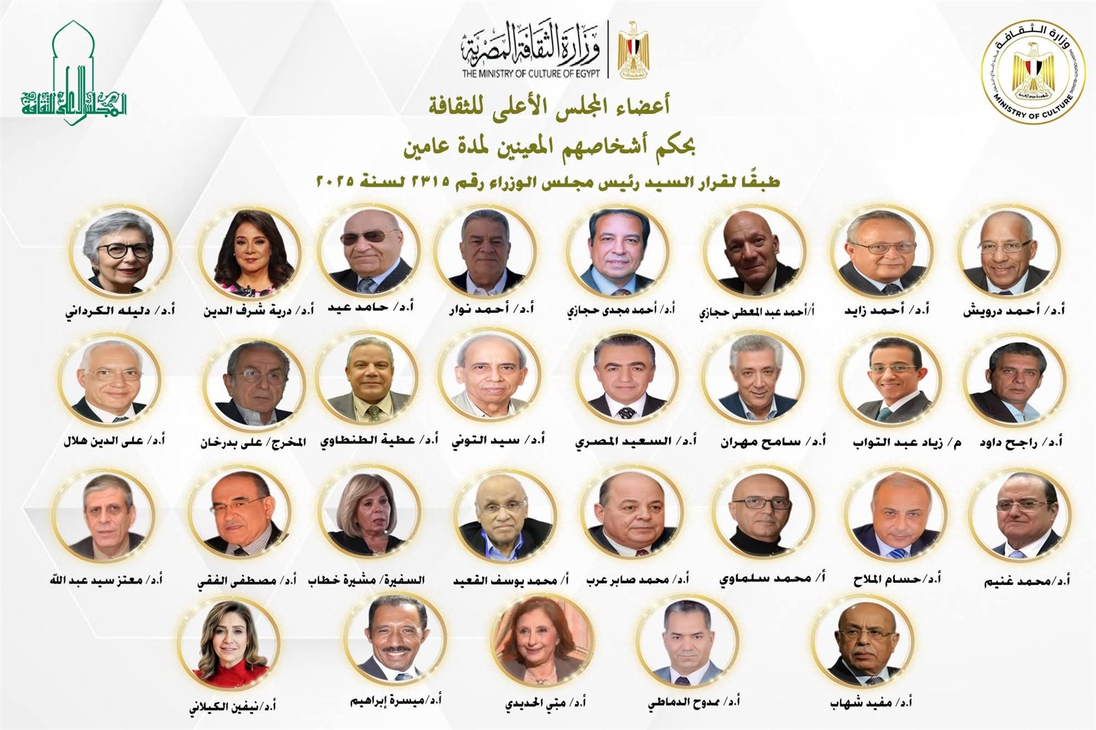 وضم التشكيل الجديد للمجلس الأعلى للثقافة: الدكتور أحمد عبد الله زايد، الشاعر أحمد عبد المعطي حجازي، الدكتور أحمد مجدي حجازي، الدكتورة نيفين الكيلاني، الدكتورة درية شرف الدين، الدكتورة دليلة الكرداني، الدكتور راجح داود، الدكتور سيد عوّاد التوني، الدكتور علي الدين هلال، الكاتب محمد سلماوي، الدكتور محمد صابر عرب، الكاتب يوسف القعيد، السفيرة مشيرة خطاب.
