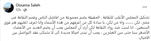 وأضاف صالح، عبر موقع فيسبوك: أنا لست ضد رواد الثقافة، لكن أرى أن المجلس يجب أن يضم العديد من الأعضاء الأصغر سنا حتى سن العشرين، يجب أن تبني أجيالا جديدة كى لا نشتكي فقد التواصل بين الأجيال.