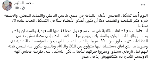 ومن جانبه، قال الكاتب الصحفي محمد المتيم: "اليوم أُعيد تشكيل المجلس الأعلى للثقافة في مصر، بتعيين البعض والتمديد للبعض، والحقيقة شيء مثير للضحك والغضب معًا أن يكون أصغر الأعضاء سنًا في التشكيل الجديد عنده 70 سنة!".