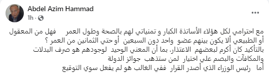وقال الكاتب الصحفي عبد العظيم حماد، رئيس تحرير الأهرام الأسبق: "مع احترامي لكل هؤلاء الأساتذة الكبار وتمنياتي لهم بالصحة وطول العمر فهل من المعقول أو الطبيعي ألا يكون بينهم عضو واحد دون السبعين أو حتي الثمانين من العمر؟".