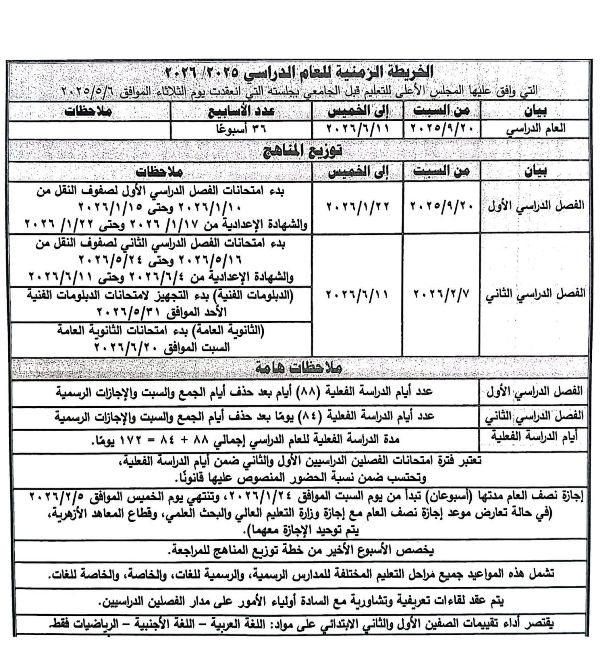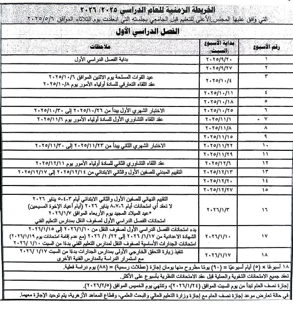 - التقييم النهائي للصفين الأول والثاني الابتدائي أيام3 و4 و5 يناير 2026 لا تعقد أي امتحانات أيام 6 و7 يناير 2026 أيام أعياد الإخوة المسيحين عيد الميلاد المجيد يوم الأربعاء الموافق 7 يناير.