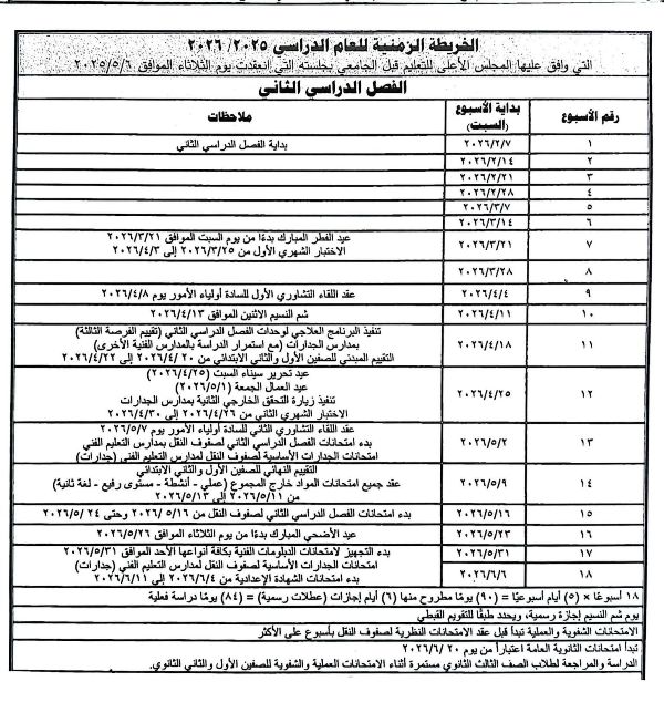 - بدء امتحانات الفصل الدراسي الأول لصفوف النقل من 10 يناير إلى يناير 15 الشهادة الإعدادية من 17 يناير إلى 22 يناير 2026 مع عدم إقامة امتحانات يوم (يناير 19) امتحانات الجدارات الأساسية لصفوف النقل المدارس التعليم الفني بدءًا من السبت 10 يناير.