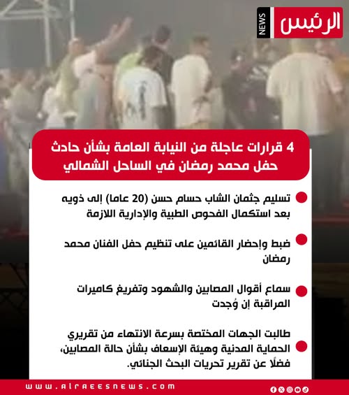 كما قررت نيابة العلمين العامة ضبط وإحضار القائمين على تنظيم حفل الفنان محمد رمضان الذي أقيم بالساحل الشمالي في محافظة مطروح، وذلك على خلفية الحادث المأساوي الذي وقع أثناء الحفل.