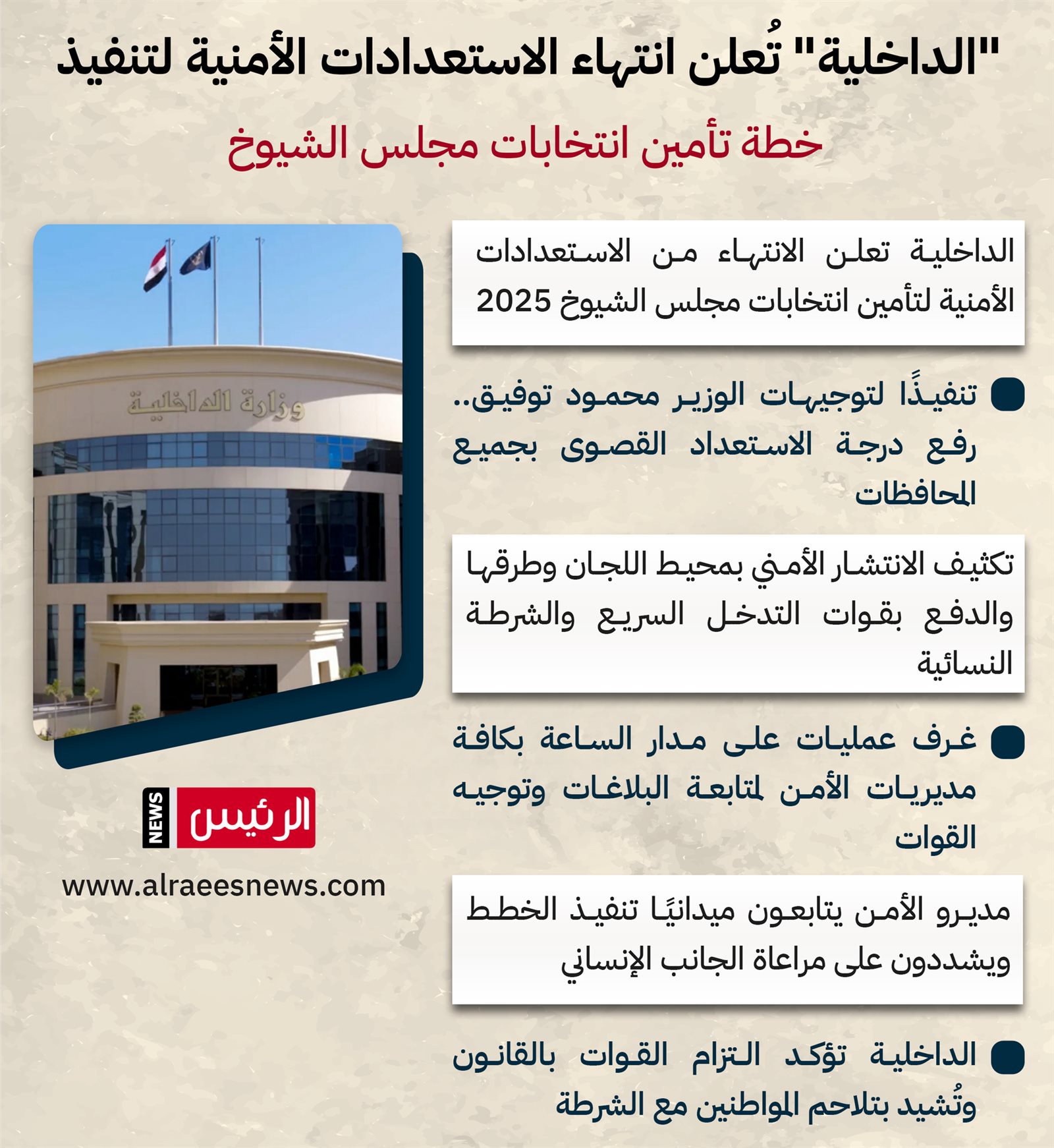 أعلنت وزارة الداخلية انتهاء استعداداتها الأمنية، لتنفيذ خطة تأمين انتخابات مجلس الشيوخ لعام 2025 على مستوى الجمهورية، لتوفير المناخ الآمن للمواطنين، وتأمين قيامهم بممارسة حقهم فى الإدلاء بأصواتهم الانتخابية؛ وذلك تنفيذا لتوجيهات اللواء محمود توفيق وزير الداخلية.