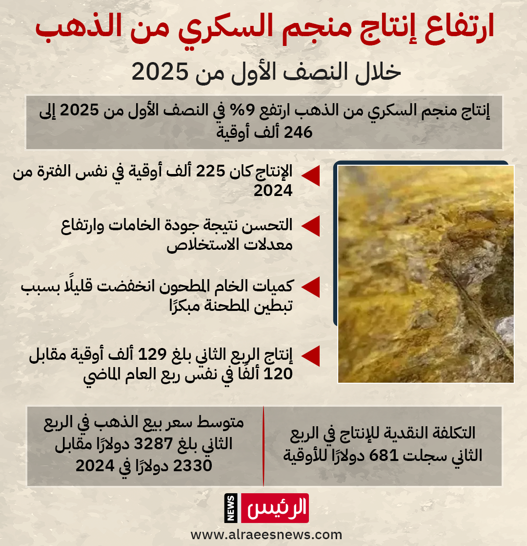 سجل إنتاج منجم السكرى من الذهب ارتفاعًا بنسبة 9% خلال النصف الأول من عام 2025، ليصل إلى 246 ألف أوقية، مقابل 225 ألف أوقية خلال الفترة نفسها من العام الماضي.