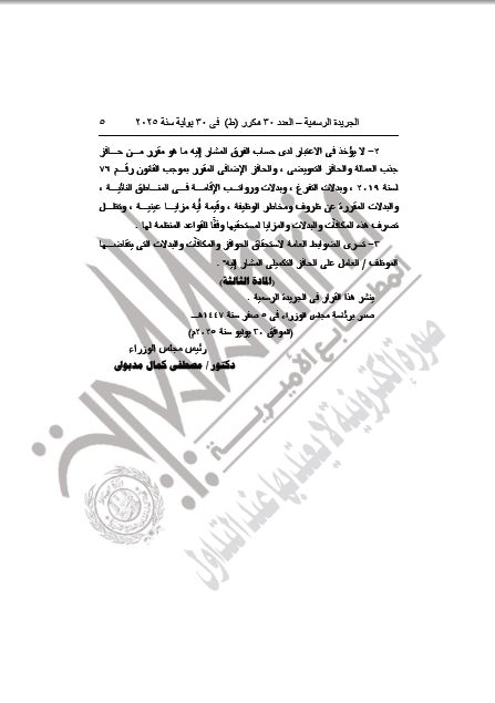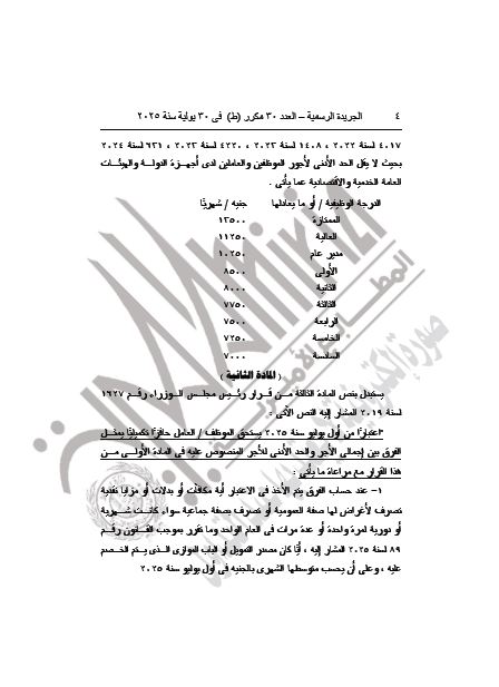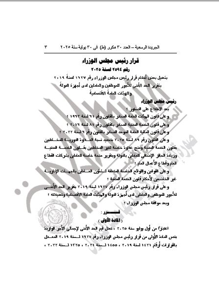 نشرت الجريدة الرسمية في عددها الصادر، اليوم الأحد، قرار رئيس مجلس الوزراء رقم 3594 لسنة 2025 بشأن تحديد الحد الأدني للأجور للموظفين والعاملين لدى أجهزة الدولة والهيئات العامة الاقتصادية.